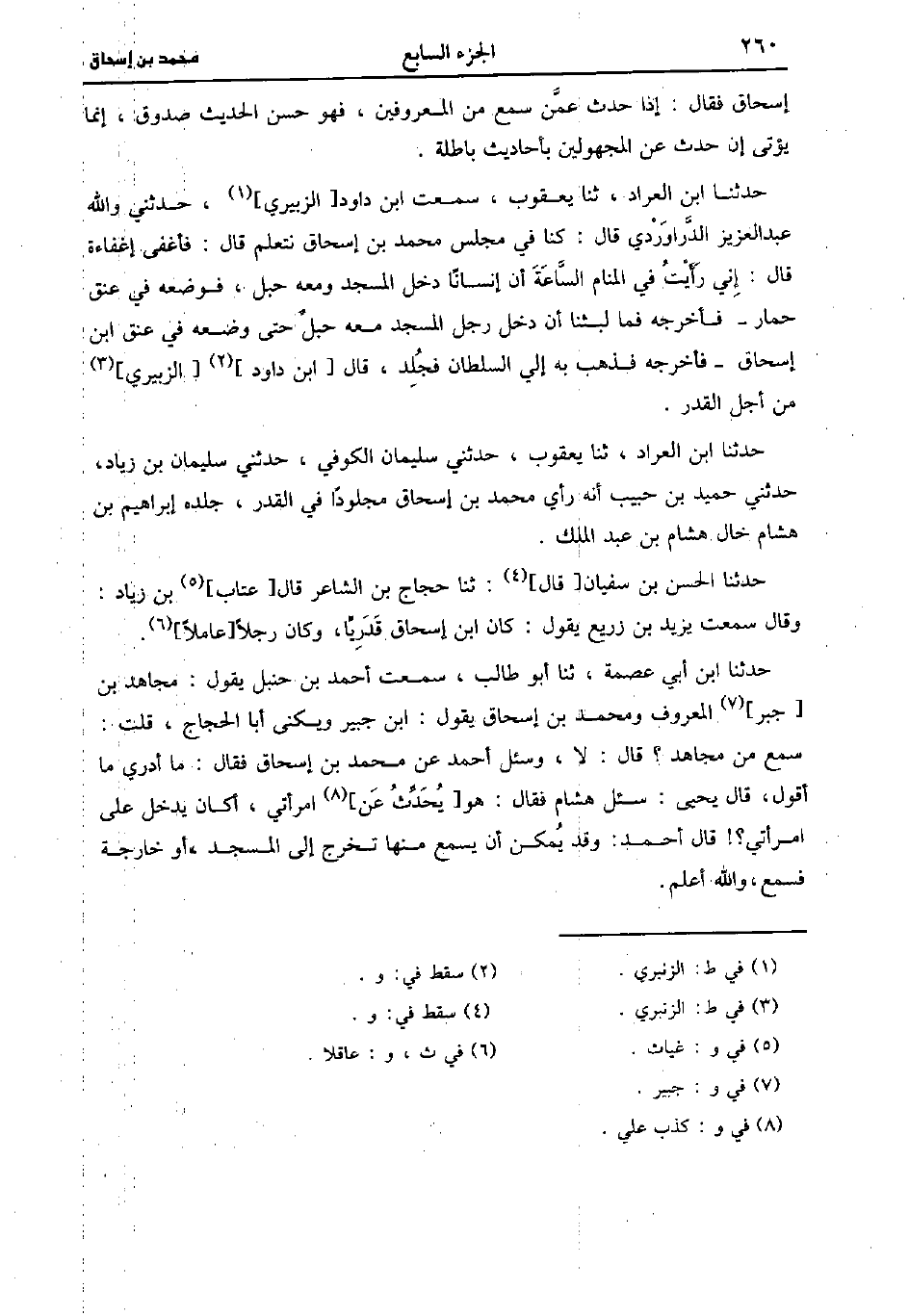 حَدَّثَنَا ابن العراد، حَدَّثَنا يعقوب سمعتُ ابن داود الزنبري، حَدَّثني والله عَبد العزيز الدراوردي قَال: كُنا فِي مجلس مُحَمد بن إسحاق نتعلم قَالَ فأغفى إغفاءة قَالَ إني رأيت فِي المنام الساعة أن إنسانا دخل المسجد ومعه حبل فوضعه فِي عنق حمار فأخرجه فما لبثنا أن دخل رجل المسجد معه حبل حتى وضعه فِي عنق بن إسحاق فأخرجه فذهب به إِلَى السلطان فجلد قَالَ ابن داود الزنبري من أجل القدر.