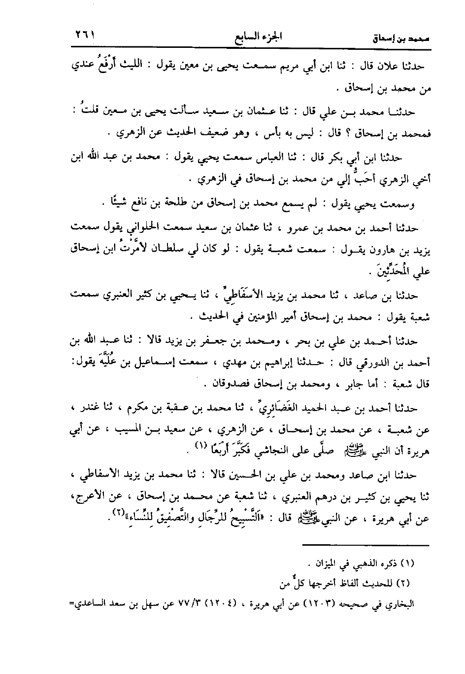 حَدَّثَنَا ابْنُ صَاعِدٍ، وَمُحمد بْنُ عَلِيِّ بْنِ الْحُسَيْنِ، قالا: حَدَّثَنا مُحَمد بْنُ يَزِيدَ الأَسْفَاطِيُّ، حَدَّثَنا يَحْيى بْنُ كَثِيرِ بْنِ دِرْهَمٍ العنبري، حَدَّثَنا شُعْبَة عَنْ مُحَمد بْنِ إِسْحَاقَ عَنِ الأَعْرَجِ، عَن أَبِي هُرَيْرَةَ عَنِ النَّبِيِّ صَلَّى اللَّهُ عَلَيه وسَلَّم قَال: التَّسْبِيحُ لِلرِّجَالِ والتصفيق للنساء