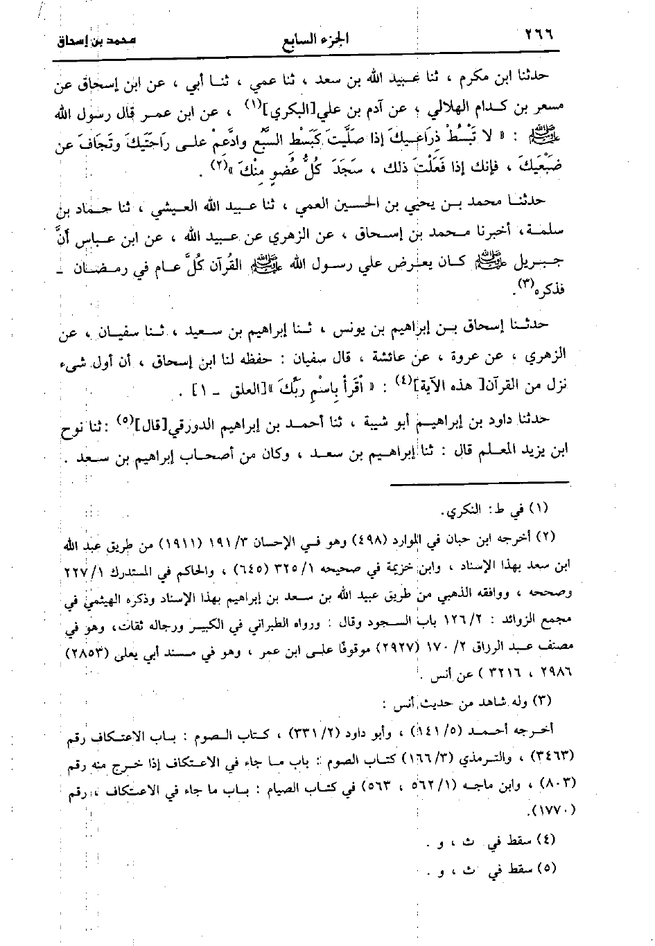 ، حَدَّثَنا ابن مكرم، حَدَّثَنا عُبَيد اللَّهِ بْنُ سَعِيد، حَدَّثَنا عمي، حَدَّثَنا أَبِي، عنِ ابْنِ إِسْحَاقَ عَنْ مِسْعَرِ بْنِ كِدَامٍ الْهِلالِيِّ عَنْ آدَمَ بْنِ عَلِيٍّ النُّكَرِيِّ، عنِ ابْنُ عُمَر قَال رَسُول اللهِ صَلَّى اللَّهُ عَلَيهِ وَسلَّمَ: لاَ تبسط ذارعيك إِذَا صَلَّيْتَ كَبَسْطِ السَّبْعِ وَادَّعِمْ عَلَى رَاحَتَيْكَ وَتَجَافَ عَنْ ضَبْعَيْكَ فَإِنَّكَ إِذَا فَعَلْتَ ذَلِكَ سَجَدَ لك كُلُّ عُضْوٍ مِنْكَ.