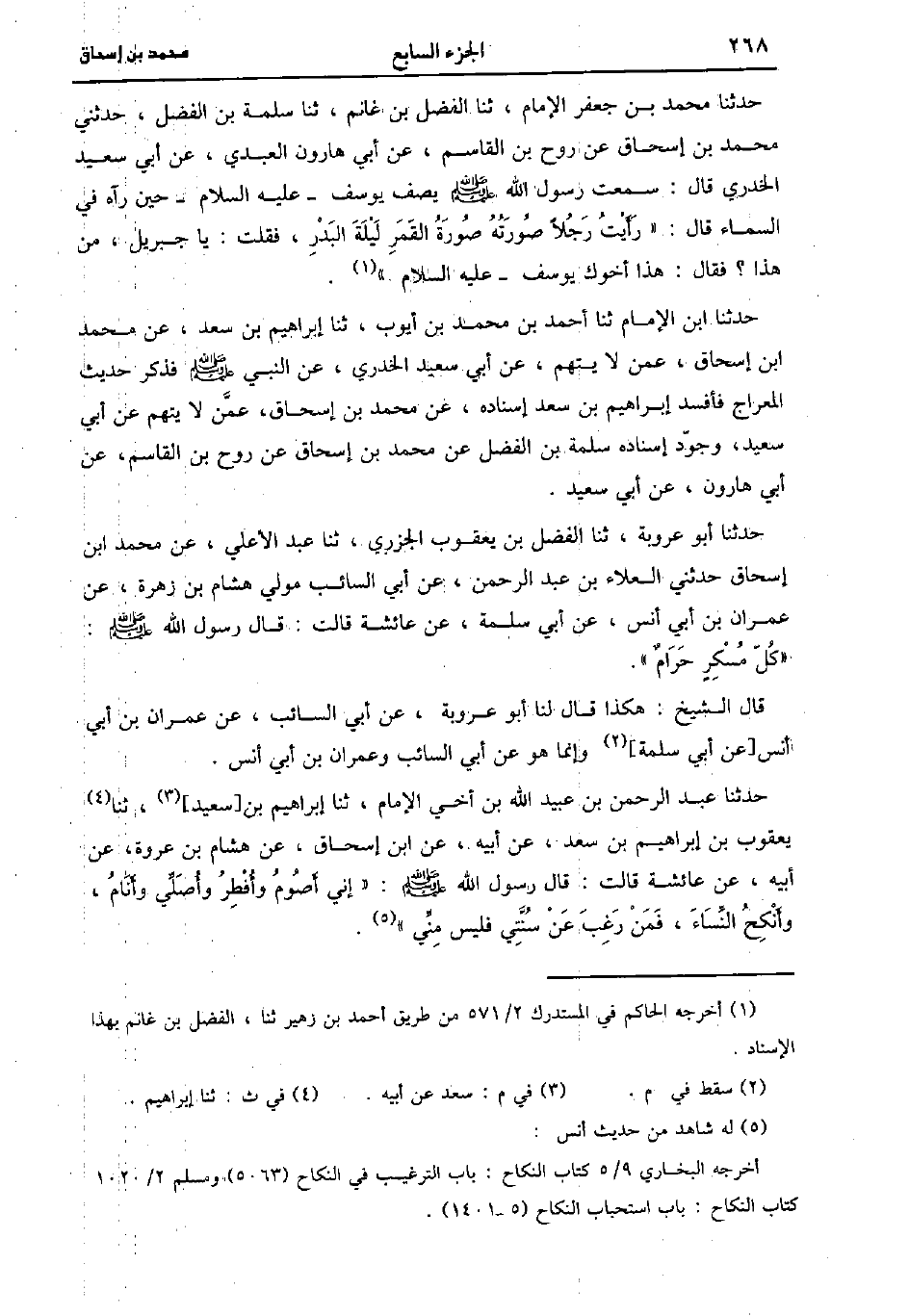حَدَّثَنَا عَبد الرَّحْمَنِ بْنُ عُبَيد اللَّهِ بْنِ أَخِي الإِمَامِ، حَدَّثَنا إِبْرَاهِيمُ بْنُ سَعِيد، حَدَّثَنا يَعْقُوبُ بْنُ إِبْرَاهِيمَ بْنِ سَعْدٍ، عَنْ أَبِيهِ، عنِ ابْنِ إِسْحَاقَ عَنْ هِشَامِ بْنِ عُرْوَةَ، عَنْ أَبِيهِ عَنْ عَائِشَةَ قَالَتْ قَال رَسُول اللهِ صَلَّى اللَّهُ عَلَيهِ وَسلَّمَ إِنِّي أَصُومُ وَأُفْطِرُ وَأُصَلِّي وَأَنَامُ وَأَنْكِحُ النِّسَاءَ فَمَنْ رَغِبَ عن سنتي فليس مني
