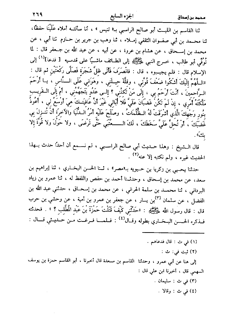 ، حَدَّثَنا الْقَاسِمُ بْنُ اللَّيْثِ أَبُو صَالِحٍ الرَّاسِبِيُّ بِتِنِّيسَ أَنَا سَأَلْتُهُ أملاه علينا حفظا، حَدَّثَنا مُحَمد بْنُ أَبِي صَفْوَانَ الثَّقَفِيُّ املاء، حَدَّثَنا وَهْبُ بْنُ جَرِيرِ بْنِ حَازِمٍ، حَدَّثَنا أَبِي عَنْ مُحَمد بْنِ إِسْحَاقَ عَنْ هِشَامِ بْنِ عُرْوَةَ، عَنْ أَبِيهِ عَنْ عَبد اللَّهِ بْنِ جَعْفَرٍ قَال: لَمَّا تُوُفِّيَ أَبُو طَالِبٍ خَرَجَ النَّبِيُّ صَلَّى اللَّهُ عَلَيهِ وَسلَّمَ إِلَى الطَّائِفِ مَاشِيًا عَلَى قَدَمَيْهِ فَدَعَا إِلَى الإِسْلامِ قَالَ فَلَمْ يُجِيبُوهُ قَالَ فَانْصَرَفَ فَأَتَى ظِلَّ شَجَرَةٍ فَصَلَّى رَكْعَتَيْنِ ثُمَّ قَالَ اللَّهُمَّ إِلَيْكَ أَشْكُو ضِعْفَ قُوَّتِي وَقِلَّةَ حِيلَتِي وَهَوَانِي عَلَى النَّاسِ يَا أَرْحَمَ الرَّاحِمِينَ أَنْتَ أَرْحَمُ بِي إِلَى مَنْ تَكِلُنِي إِلَى عَدُوٍ يَتَجَهَّمُنِي أَمْ إِلَى الْقَرِيبِ مَلَّكْتَهُ أَمْرِي إِنْ لَمْ تَكُنْ غَضْبَانًا عَلَيَّ فَلا أُبَالِي غَيْرَ أَنَّ عَافِيَتَكَ هِيَ أوسع لي أعوذ بنور ووجهك الَّذِي أَشْرَقَتْ لَهُ الظُّلُمَاتُ وَصَلَحَ عَلَيْهِ أَمْرُ الدُّنْيَا وَالآخِرَةِ أَنْ تُنْزِلَ بِي غَضَبَكَ أَوْ تُحِلَّ عَلَيَّ سَخَطَكَ لَكَ الْعُتْبَي حَتَّى تَرْضَى، ولاَ حَوْلَ، ولاَ قُوَّةَ إلاَّ بِكَ.