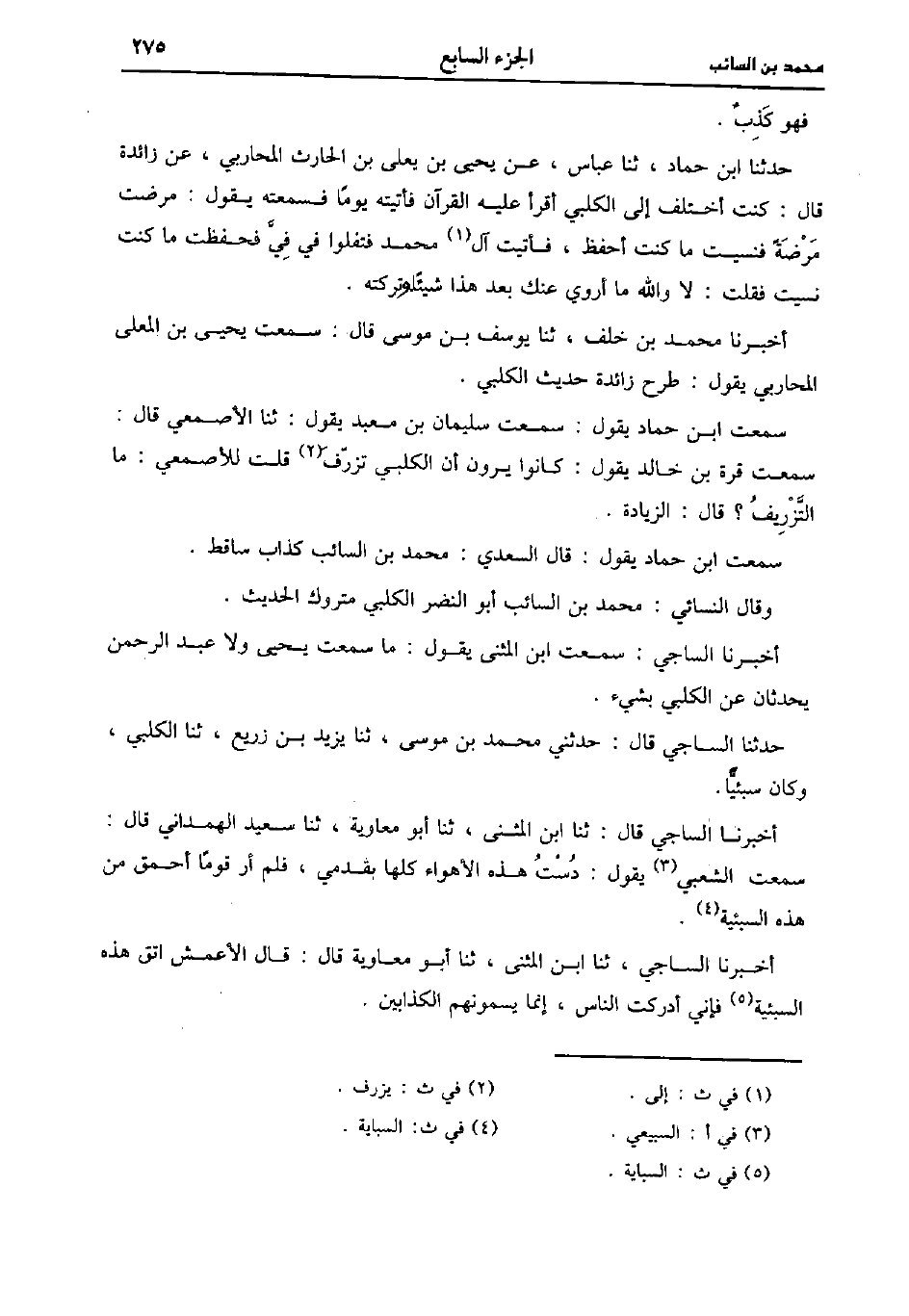 حَدَّثَنَا جنيدي، حَدَّثَنا البُخارِيّ قَالَ مُحَمد بن السائب أَبُو النضر الكلبي الكوفي تركه يَحْيى بن سَعِيد، وابن مهدي قال علي، حَدَّثَنا يَحْيى عن سفيان قَال لي الكلبي قَال لي أَبُو صَالِح كل ما حدثتك فهو كذب.