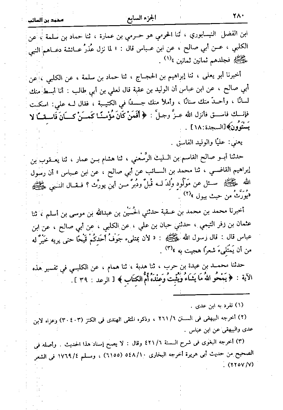 حَدَّثَنَا أَبُو قَصِيٍّ الدِّمَشْقِيُّ، حَدَّثَنا سُلَيْمَانُ بْنُ عَبد الرحمن، حَدَّثَنا ابْنِ عَيَّاشٍ، حَدَّثَنا مُحَمد بْنُ السَّائِبِ الْكَلْبِيِّ، عَن أَبِي صَالِحٍ، عنِ ابْنِ عَبَّاسٍ عَنِ النَّبِيِّ صَلَّى اللَّهُ عَلَيه وسَلَّم قَال: لا تَقُومُ السَّاعَةُ حَتَّى يَلْتَقِي الشَّيْخَانِ فَيَقُولُ أَحَدُهُمَا لِصَاحِبِهِ مَتَى ولدت