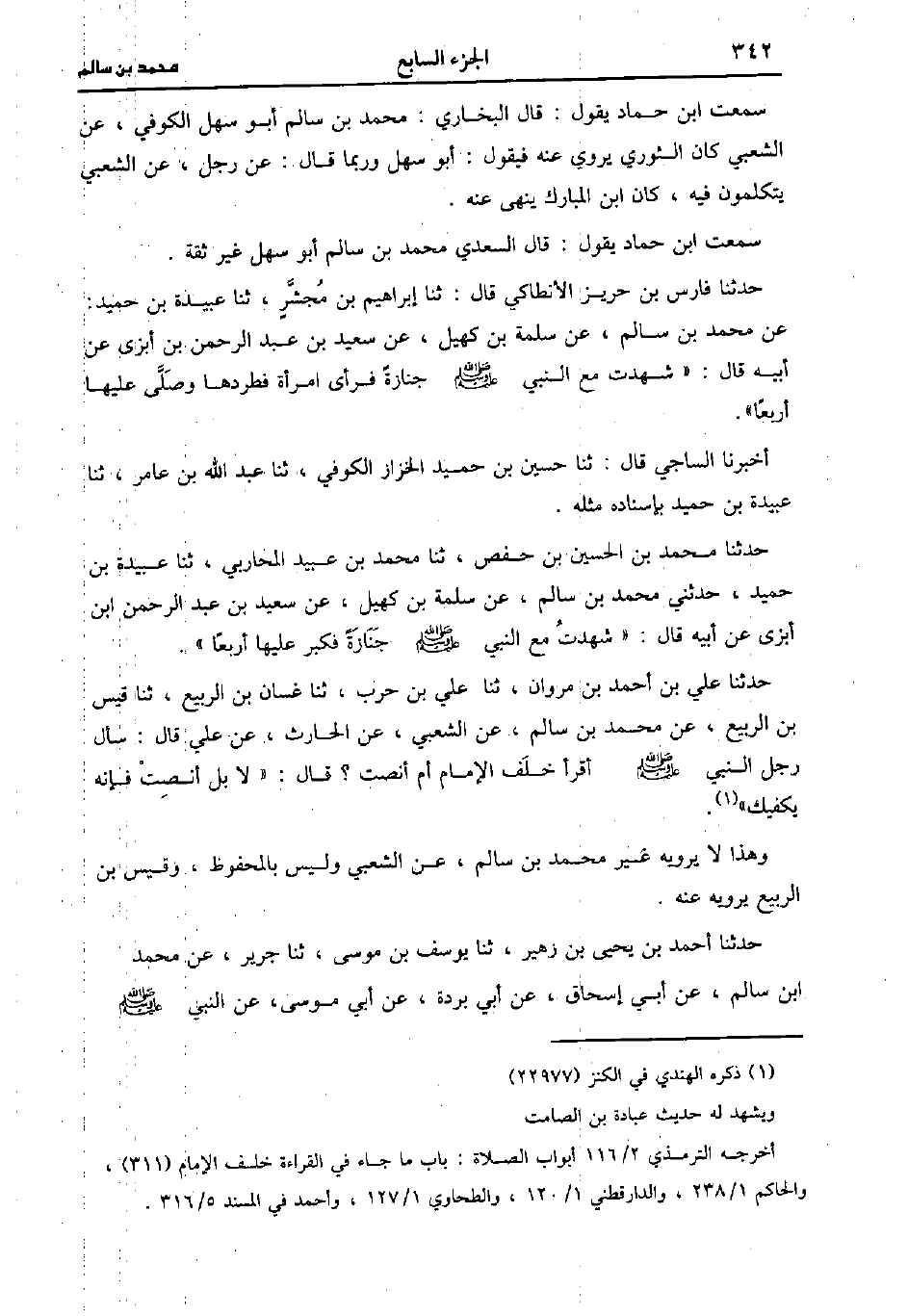 حَدَّثَنَا ابن حماد، حَدَّثني عَبد الله بن أحمد، حَدَّثَنا حسن بن عيسى قَالَ: ترك بن مبارك مُحَمد بن سالم وعبيدة بن معتب والسري بن إسماعيل