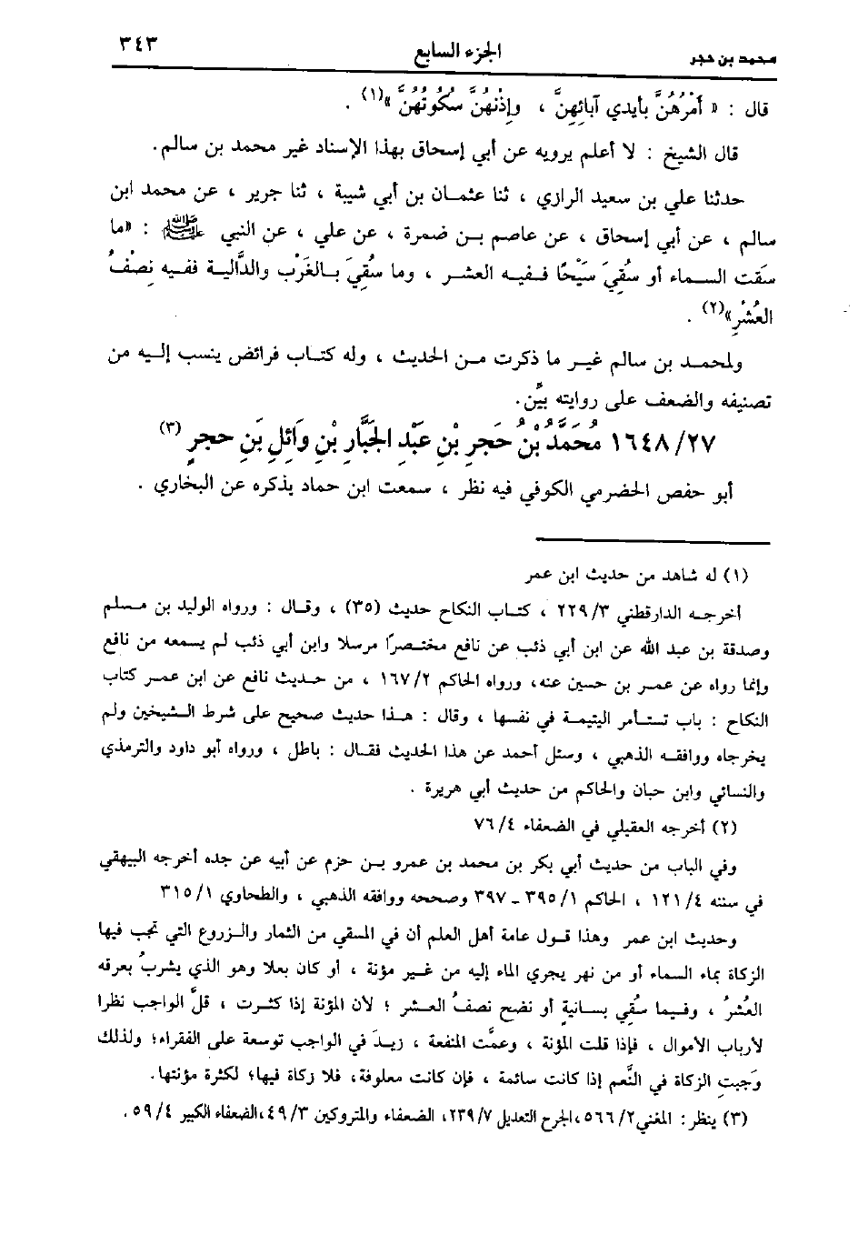 ، حَدَّثَنا ابن حماد قَالَ وحدثني نصر بن مرزوق سمعت نعيم بن حماد، قَال: كَانَ ابن المبارك متحوزا فِي الحديث فإذا مر بحديث مُحَمد بن سالم قَالَ اضربوا عليه اضربوا عليه.
