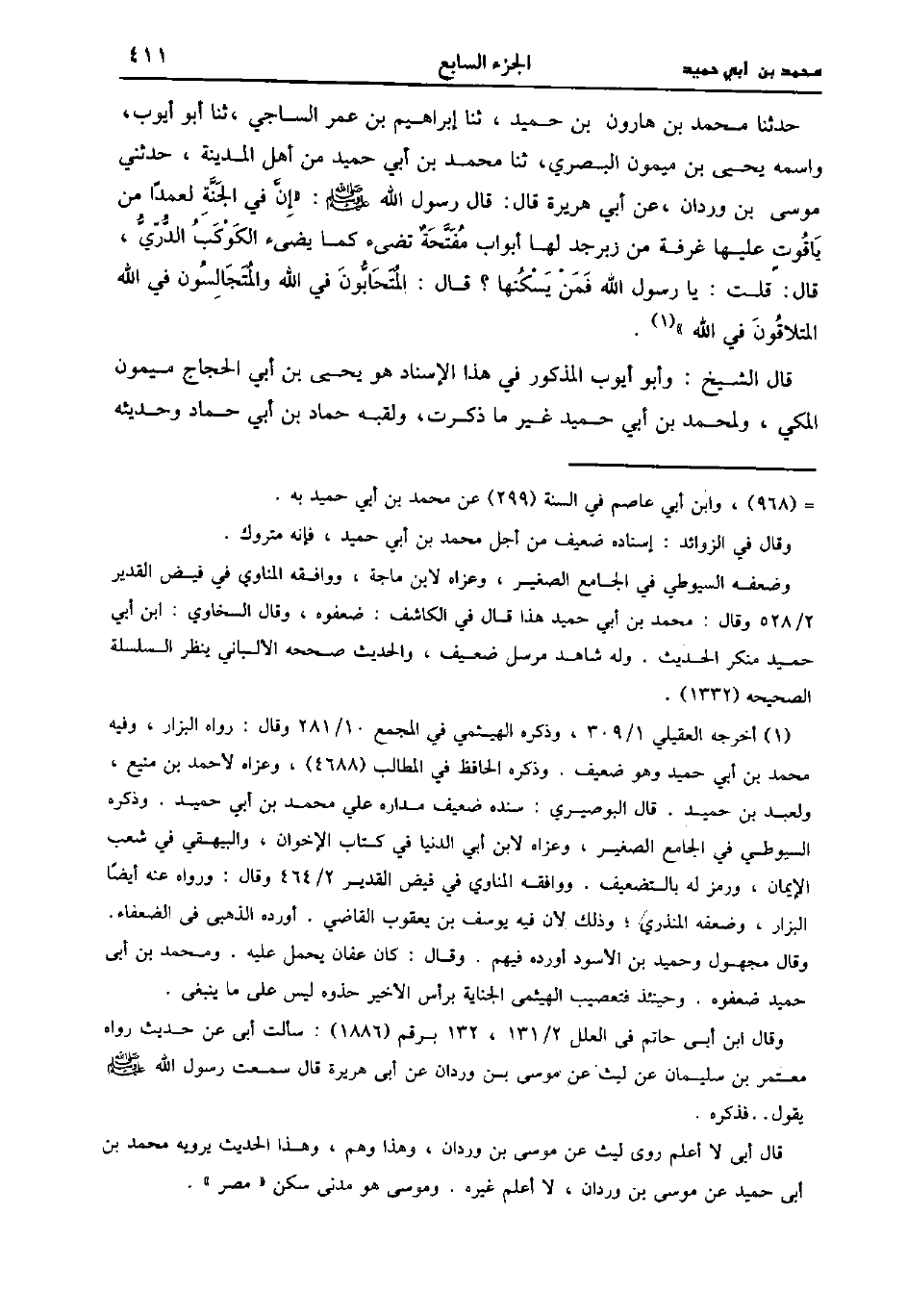 حَدَّثَنَا الجنيدي، قَال: حَدَّثَنا البُخارِيّ قَالَ مُحَمد بْنُ أَبِي حُمَيْدٍ وَيُقَالُ حَمَّادُ بْنُ أَبِي حُمَيْدٍ أَبُو إبراهيم الزرقي الأنصاري المديني منكر الحديث.