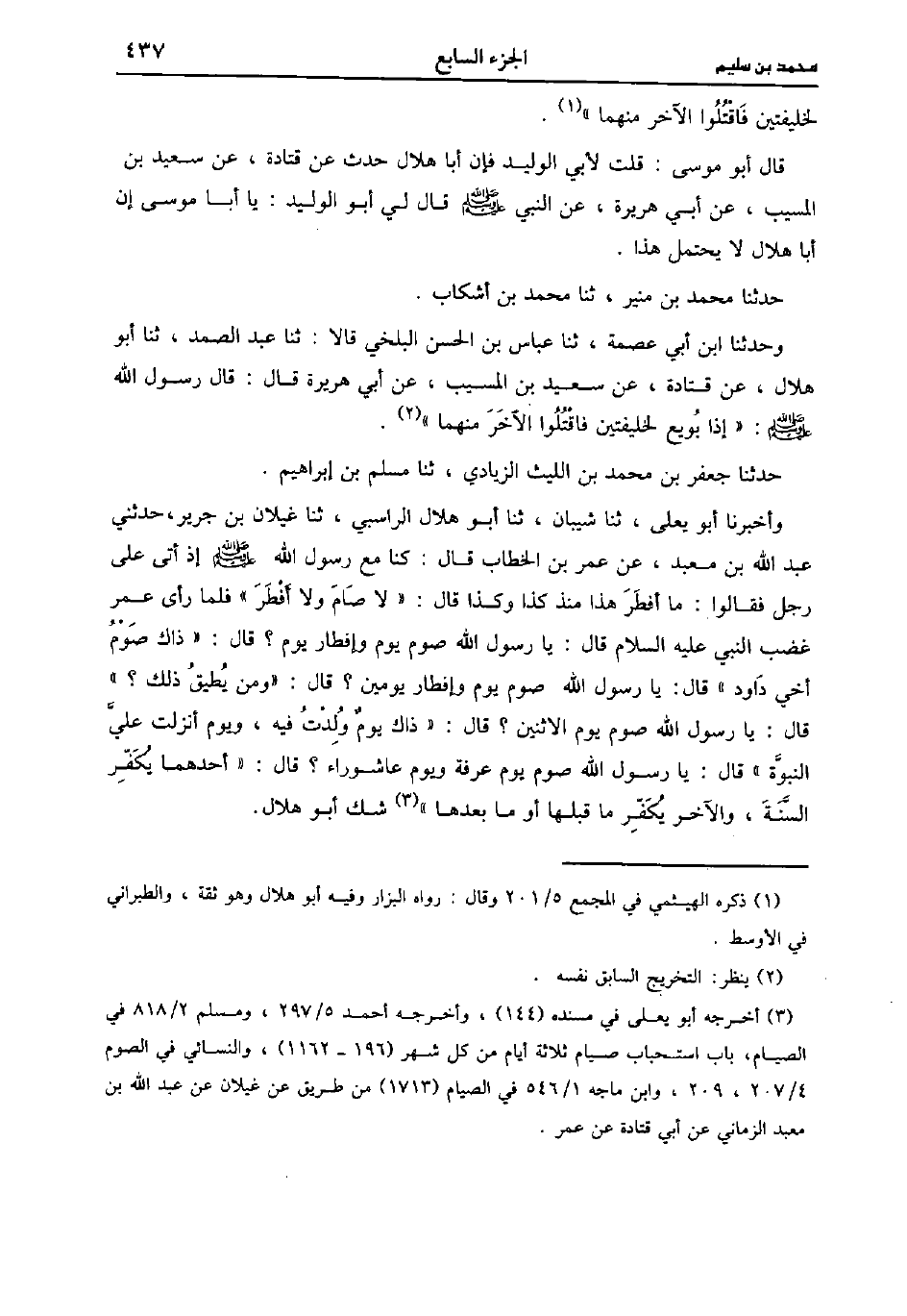 حَدَّثَنَا أَحْمَدُ بْنُ يَحْيى بْنِ زُهَيْرٍ، حَدَّثَنا أَبُو مُوسَى مُحَمد بْنُ الْمُثَنَّى، حَدَّثَنا أَبُو الْوَلِيدِ عَنْ هَمَّامٍ، عَن قَتادَة عَنْ سَعِيد بْنِ المُسَيَّب، قَال: قَال رَسُولُ اللَّهِ صَلَّى اللَّهُ عَلَيْهِ وَسَلَّمَ إِذَا بُويِعَ