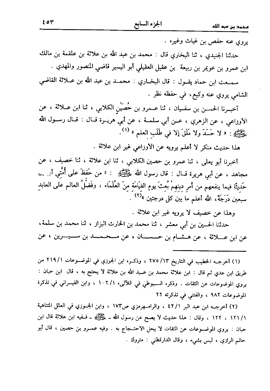 حَدَّثَنَا ابن أبي عصمة، حَدَّثَنا الفضل بن زياد سألت أبا عَبد اللَّهِ أحمد بن حنبل عن مُحَمد بْن عَبد اللَّه بْن علاثة من هُوَ فقال: كَانَ من أهل الجزيرة.