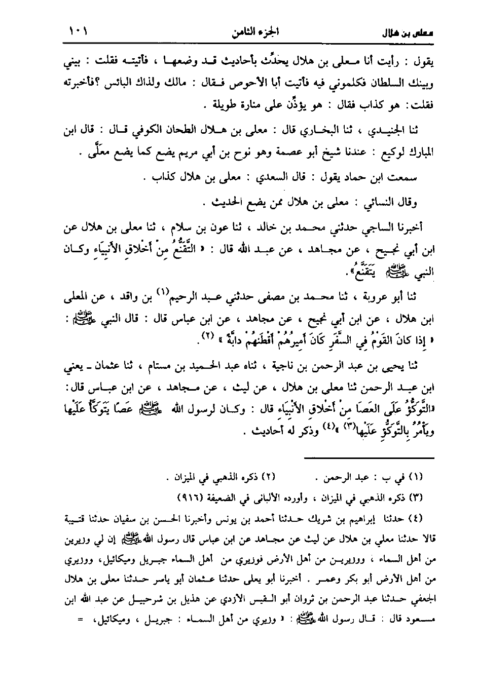 حَدَّثَنَا يَحْيى بْنُ عَبد الرَّحْمَنِ بن ناجية حَدَّثَنَاهُ عَبد الحميد بن مستام، حَدَّثَنا عثمان يَعني ابن عَبد الرحمن، حَدَّثَنا معلى بن هلال عَنْ لَيْثٍ عَنْ مُجَاهِدٍ، عنِ ابن عباس قال التوكؤ على العصا من أخلاق الأنبياء قال وكان لِرَسُولِ اللَّهِ صَلَّى اللَّهُ عَلَيهِ وَسلَّمَ عصا يتوكأ عليها ويأمر بالتوكؤ عليها وذكر له أحاديث