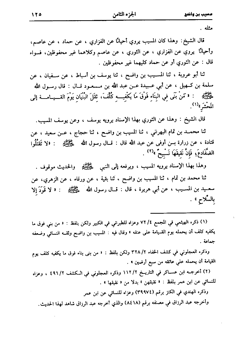 حَدَّثَنَا أبو عَرُوبة، حَدَّثَنا المُسَيَّب بْنُ وَاضِحٍ، حَدَّثَنا يُوسُفُ بْنُ أَسْبَاطٍ عَنْ سُفيان، عَن سَلَمَةَ بْنِ كُهَيْلٍ، عَن أَبِي عُبَيْدَةَ عَنْ عَبد اللَّهِ بْنِ مَسْعُودٍ، قَال: قَال رَسُولُ اللَّهِ صَلَّى اللَّهُ عَلَيْهِ وَسَلَّمَ مَنْ بَنَى فِي الْبِنَاءِ فَوْقَ مَا يَكْفِيهِ كُلِّفَ ثِقَلَ الْبُنْيَانِ يَوْمَ الْقِيَامَةِ إِلَى الْمَحْشَرِ.
