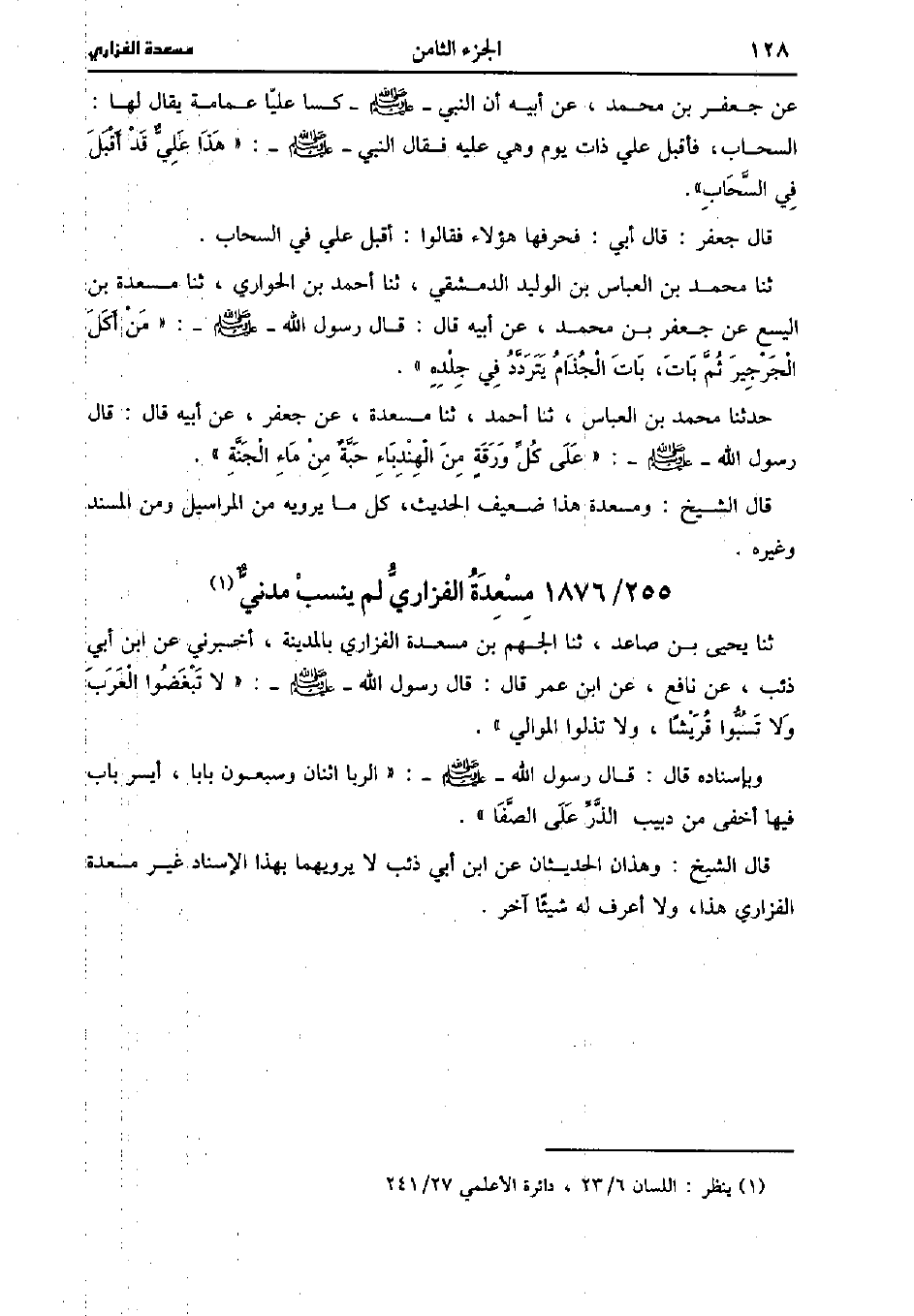 قَالَ الشَّيْخ: وَهَذَانِ الْحَدِيثَانِ، عنِ ابْنِ أَبِي ذئب لا يرويهما بهذا الإسناد غير مسعدة الفزاري هذا، ولاَ أعرف له شيئا آخر