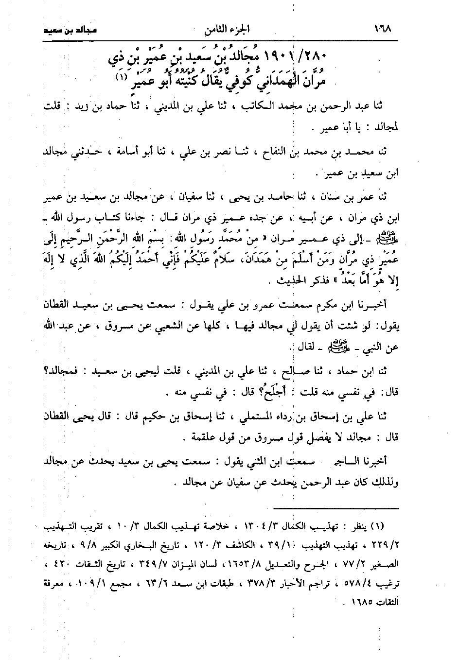 كتب إلي مُحَمد بْنُ الْحَسَنِ، حَدَّثَنا عَمْرو بن علي، حَدَّثَنا معتمر، حَدَّثَنا إسماعيل، حَدَّثَنا مُجَالِدٌ عَنْ عَامِرٍ، عَن أَبِي بَكْرِ بْنِ عَبد الرَّحْمَنِ عن عَائِشَة فذكرته ليحيى فأنكره وَقَالَ أَنَا سَمِعت مجالد يحدث عَنِ الشَّعْبِيِّ عَنْ عَبد الرَّحْمَنِ بْن الحارث وسألت يَحْيى عن حديث مجالد عن الشعبي أن عُمَر وعليا وشريحا ومسروقا قَالُوا لا نكاح إلاَّ بولي فأبي أن يحدثني وَقَالَ نهاني عَنْهُ عَبد الرَّحْمَن فقلت لَهُ فإن عَبد الرَّحْمَن، حَدَّثَنا بِهِ عن هشيم عن مجالد عن الشعبي فجعل يعجب.