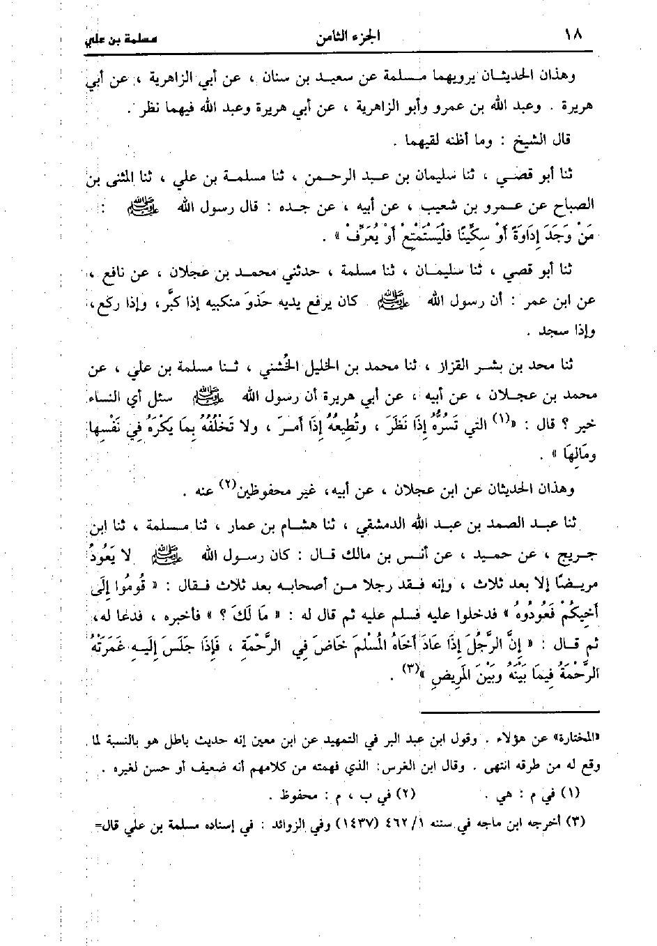 حَدَّثَنَا عَبد الصَّمَدِ بْنُ عَبد الله الدِّمَشْقِيُّ، حَدَّثَنا هِشَامُ بْنُ عَمَّارٍ، حَدَّثَنا مسلمة، حَدَّثَنا ابْنُ جُرَيج، عَن حُمَيْدٍ، عَن أَنَس بْنِ مَالِكِ، قَال: كَانَ رَسُولِ اللَّهِ صَلَّى اللَّهُ عَلَيْهِ وَسَلَّمَ: لاَ يَعُودُ مَرِيضًا إلاَّ بَعْدَ ثَلاثٍ وَأَنَّهُ فَقَدَ رَجُلا مِنْ أَصْحَابِهِ بَعْدَ ثَلاثٍ فَقَالَ قُومُوا إِلَى أَخِيكُمْ فَعُودُوهُ فَدَخَلُوا عَلَيْهِ فَسَلَّمَ عَلَيْهِ ثُمَّ قَالَ لَهُ مَا لَكَ فَأَخَبَرَهُ فَدَعَا لَهُ ثُمَّ قَال: إِن الرَّجُلَ إِذَا عَادَ أَخَاهُ الْمُسْلِمَ خَاضَ فِي الرَّحْمَةِ فَإِذَا جَلَسَ إِلَيْهِ غَمَرَتْهُ الرَّحْمَةُ فِيمَا بَيْنَهُ وَبَيْنَ المريض