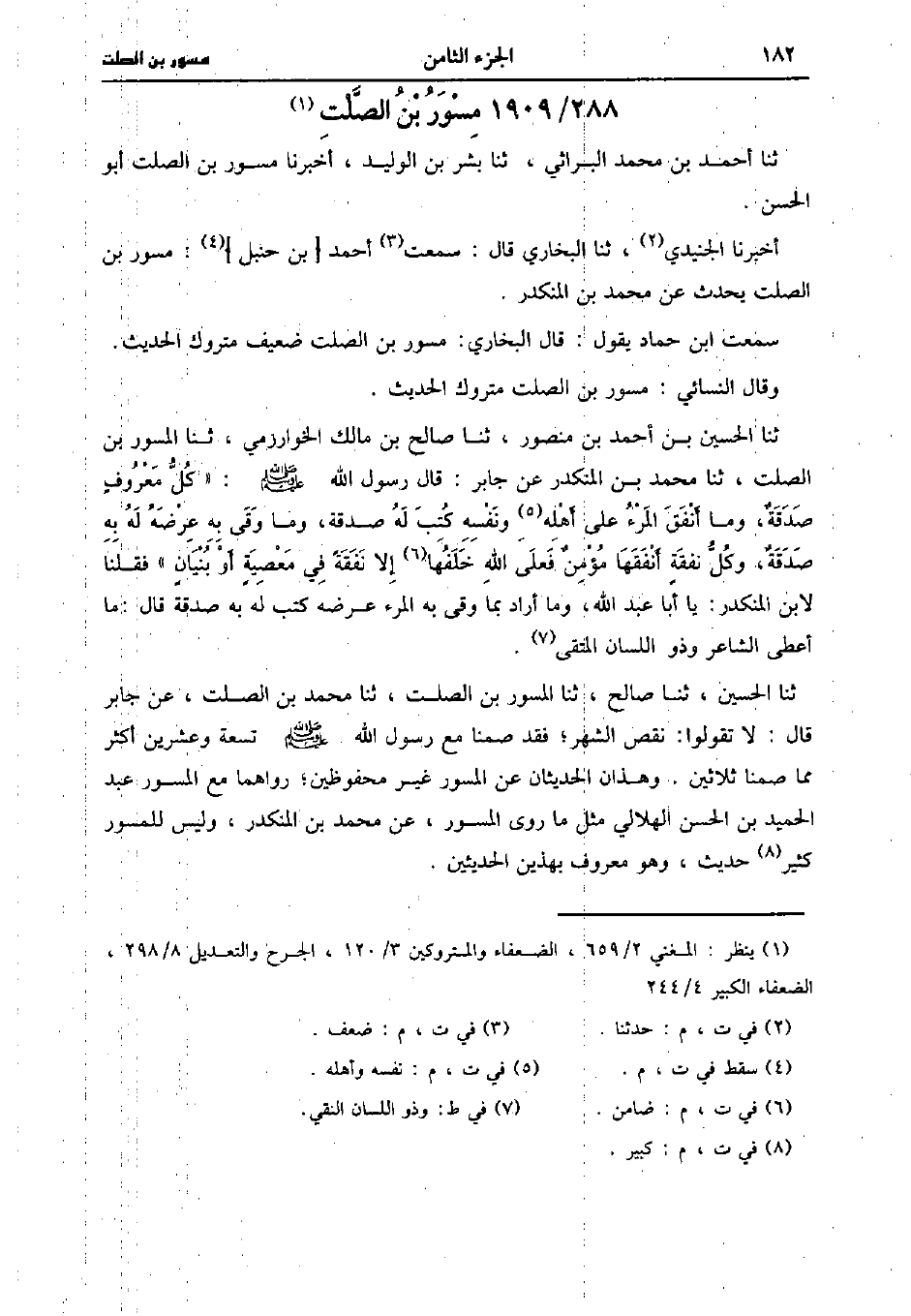حَدَّثَنَا علان، حَدَّثَنا موسى بن سابق، حَدَّثَنا ابْنُ وَهب، عَنِ الْمَاضِي عَنْ هِشام، عَن الْحَسَنِ، عَن إِسْمَاعِيلَ عَنِ النَّبِيِّ صَلَّى اللَّهُ عَلَيه وسَلَّم قَال: أَلا أُخْبِرُكُمْ بِأَشْقَى الأَشْقِيَاءِ قَالُوا بَلَى يَا رَسُولَ اللهِ قَالَ مَنِ اجْتَمَعَ عَلَيْهِ فَقَرُ الدُّنْيَا وَعَذَابُ الآخِرَةِ وهذه الأحاديث الَّتِي ذكرتها غير محفوظة وللماضي غير ما ذكرت قليل وعامة ما يرويه، لاَ يُتَابَعُ عَليه، ولاَ أعلم روى عَنْهُ غير بن وَهْب.