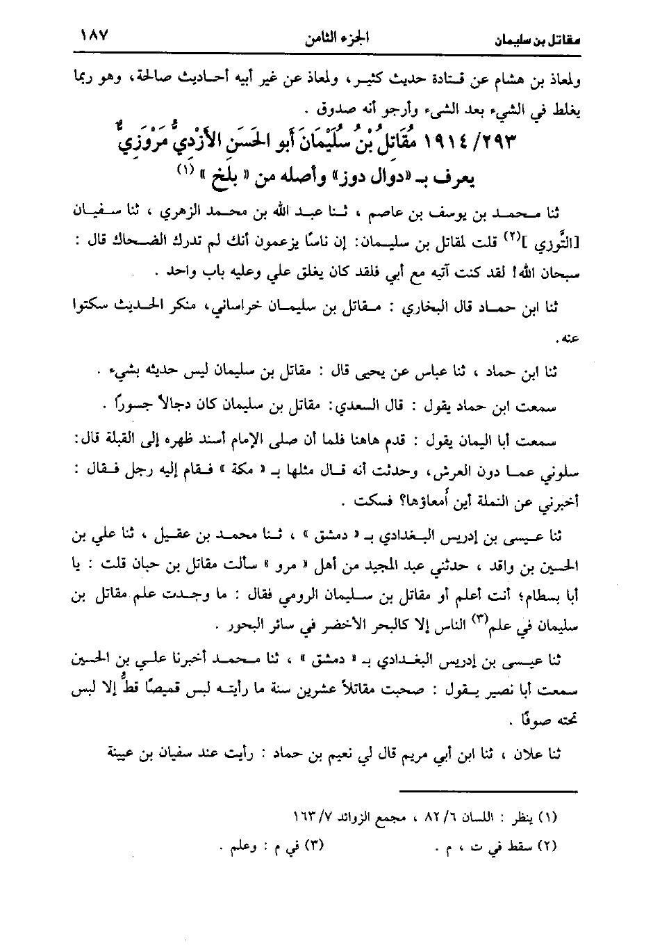 حَدَّثَنَا مُحَمد بن الدورقي، حَدَّثَنا مُحَمد بن إسماعيل الصائغ، حَدَّثَنا نعيم سَمِعت بَقِيَّة يَقُول كَانَ مقاتل يذكر عند شُعْبَة فما رأيته يَقُول فيه إلاَّ خيرا.