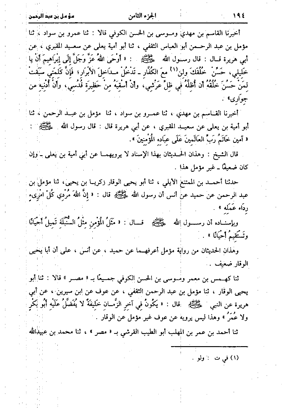 حَدَّثَنَا بهلول الأنباري، حَدَّثَنا أبو مصعب، حَدَّثَنا مُحْرِزُ بْنُ هَارُونَ الْهَدِيرِيُّ عَنِ الأَعْرَجِ، عَن أَبِي هُرَيْرَةَ قَال رَسُول اللهِ صَلَّى اللَّهُ عَلَيهِ وَسلَّمَ لَعَنَ اللَّهُ سَبْعَةً مِنْ خلقه من فوق سبع