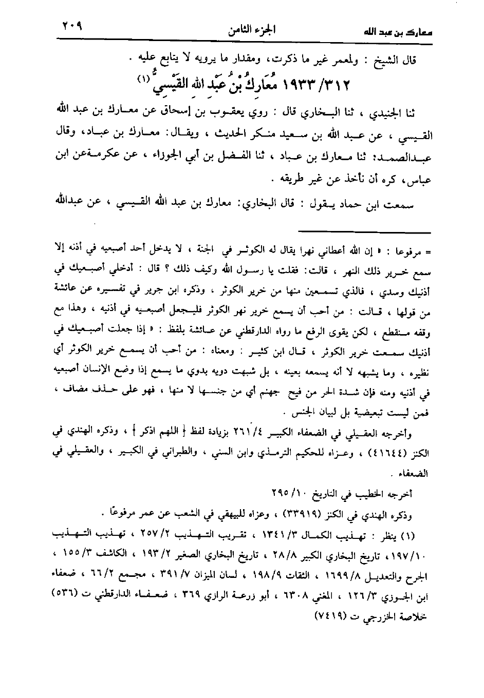 حَدَّثَنَا الجنيدي، حَدَّثَنا البُخارِيّ قال روى يَعْقُوب بْن إِسْحَاق عن معارك بْن عَبد اللَّه القيسي عَنْ عَبد اللَّهِ بْنِ سَعِيد منكر الحديث ويقال معارك بْن عباد وقال عَبد الصمد، حَدَّثَنا معارك بن عباد، حَدَّثَنا الفضل بْن أَبِي الجوزاء، عن عِكرمَة، عنِ ابْن عَبَّاس كره ان تأخذ عن غير طريقه.