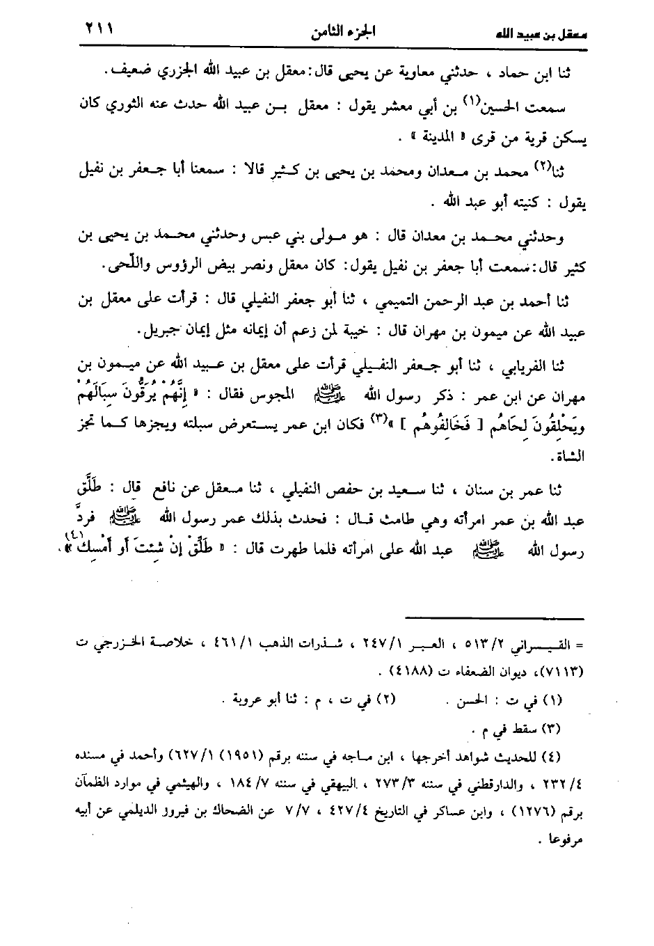 وحدثني مُحَمد بْن معدان قَالَ هو مولى قَالَ هو مولى بني عبس وحدثني مُحَمد بْن يَحْيى بْن كثير، قَالَ: سَمِعْتُ أبا جعفر بْن نفيل يَقُول كَانَ معقل ونصر بيض الرؤوس واللحا.