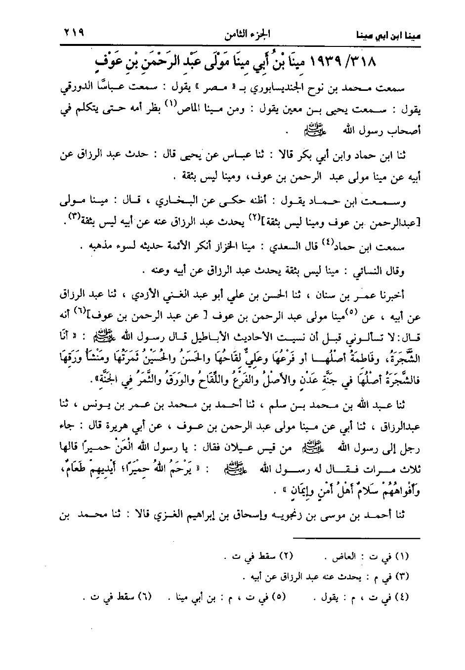 حَدَّثَنَا عُمَر بْنُ سِنَانٍ، حَدَّثَنا الْحَسَنُ بْنُ عَلِيٍّ أَبُو عَبد الغني الأزدي، حَدَّثَنا عَبد الرَّزَّاق، عَنْ أَبِيهِ عَنْ مِينَا مَوْلَى عَبد الرَّحْمَنِ بْنِ عَوْفٍ عَنْ عَبد الرَّحْمَنِ بْنِ عَوْفٍ أَنَّهُ؟ قَال: لاَ تَسْأَلُونِي قَبْلَ أَنْ نَسِيتُ الأَحَادِيثَ الأَبَاطِيلَ قَال رَسُول اللهِ صَلَّى اللَّهُ عَلَيهِ وَسلَّمَ أَنَا الشَّجَرَةُ وَفَاطِمَةُ أَصْلُهَا أَوْ فَرْعُهَا، وَعلي لِقَاحُهَا وَالْحَسَنُ، وَالحُسَين ثَمَرَتُهَا وَمَنْشَأُ وَرَقِهَا فَالشَّجَرَةُ أَصْلُهَا فِي جَنَّةِ عَدْنٍ وَالأَصْلُ وَالْفَرْعُ وَاللِقَاحُ وَالْوَرَقُ وَالثَّمَرُ فِي الْجَنَّةِ.
