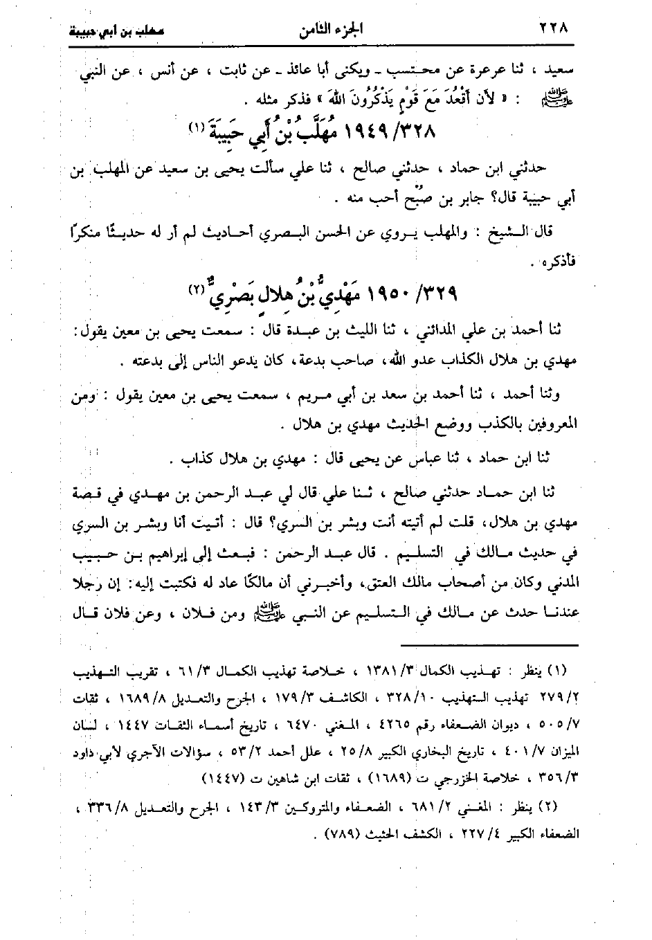 حَدَّثَنَا أَحْمَد بْن عَلِيّ الْمَدَائِنِيُّ، حَدَّثَنا اللَّيْثُ بْنُ عَبْدَةَ، قَالَ: سَمِعْتُ يَحْيى بْنَ مَعِين يَقُول مهدي بْن هلال الكذاب عدو اللَّه صاحب بدعة كَانَ يدعو الناس إلى بدعته (ح) وحدثنا أحمد، حَدَّثَنا أحمد بن سعد بن أَبِي مريم سَمِعْتُ يَحْيى بْن مَعِين يَقُولُ ومن المعروفين بالكذب ووضع الحديث مهدي بْن هلال.