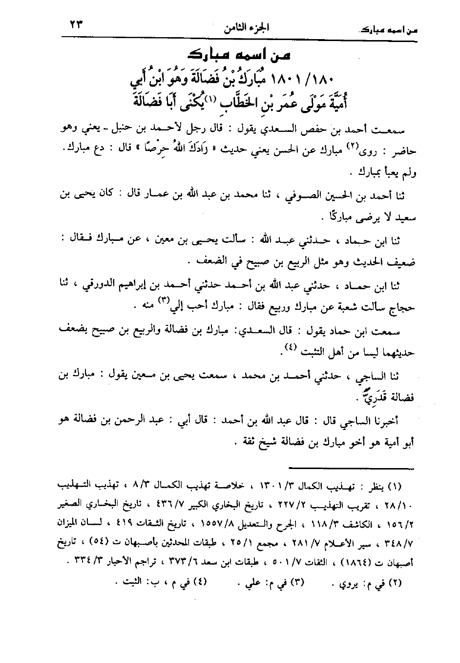 - حَدَّثَنَا الساجي، حَدَّثني أَحْمَد بْن مُحَمد سَمِعْتُ يَحْيى بْن مَعِين يَقُول مبارك بْن فضالة قدري.