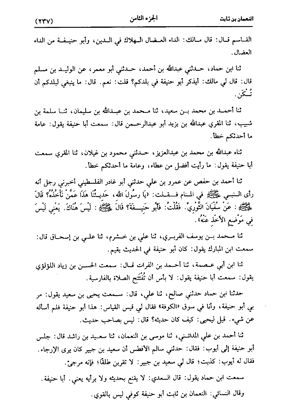 حَدَّثَنَا أَحْمَد بْن حفص عن عَمْرو بْن علي، حَدَّثني أَبُو غادر الفلسطيني أَخْبَرَنِي رجل أَنَّهُ رأى النَّبِيُّ صَلَّى اللَّهُ عَلَيهِ وَسلَّمَ فِي الْمَنَامِ فَقُلْتُ يَا رَسُولَ اللهِ، حَدَّثَنا هذا عمن نأخذه قَالَ صَلَّى اللَّهُ عَلَيهِ وَسلَّمَ عن سُفْيَان الثَّوْريّ فقلت فأبو حنيفة قَالَ صَلَّى اللَّهُ عَلَيهِ وَسلَّمَ لَيْسَ هناك يعني ليس فِي موضع الاخد عَنْهُ.