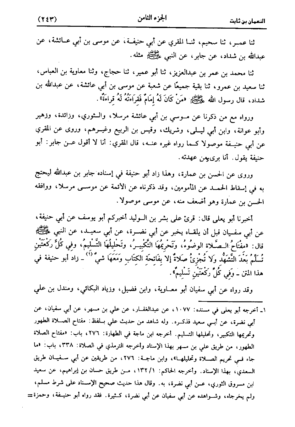 حَدَّثَنَا أَبُو يَعْلَى قَالَ قُرِئَ عَلَى بِشْرِ بْنِ الْوَلِيدِ أَخْبَرَكُمْ أَبُو يُوسُفَ، عَن أَبِي حَنِيفَةَ، عَن أَبِي سُفْيَانَ قَبْلَ أَنْ يَلْقَاهُ يُخْبِرُ، عَن أَبِي نَضْرَةَ، عَن أَبِي سَعِيد عَنِ النَّبِيِّ صَلَّى اللَّهُ عَلَيه وسَلَّم قَال: مِفْتَاحُ الصَّلاةِ الْوُضُوءُ وَتَحْرِيمُهَا التَّكْبِيرُ وَتَحْلِيلُهَا التَّسْلِيمُ وَفِي كُلِّ رَكْعَتَيْنِ تُسَلِّمُ بعد التشهد، ولاَ تجزيء صُلاةٌ إلاَّ بِفَاتِحَةِ الْكِتَابِ وَمَعَهَا شَيْءٌ زَادَ أَبُو حَنِيفَةَ فِي هَذَا الْمَتْنِ وَفِي كُلِّ رَكْعَتَيْنِ تَسْلِيمٌ.