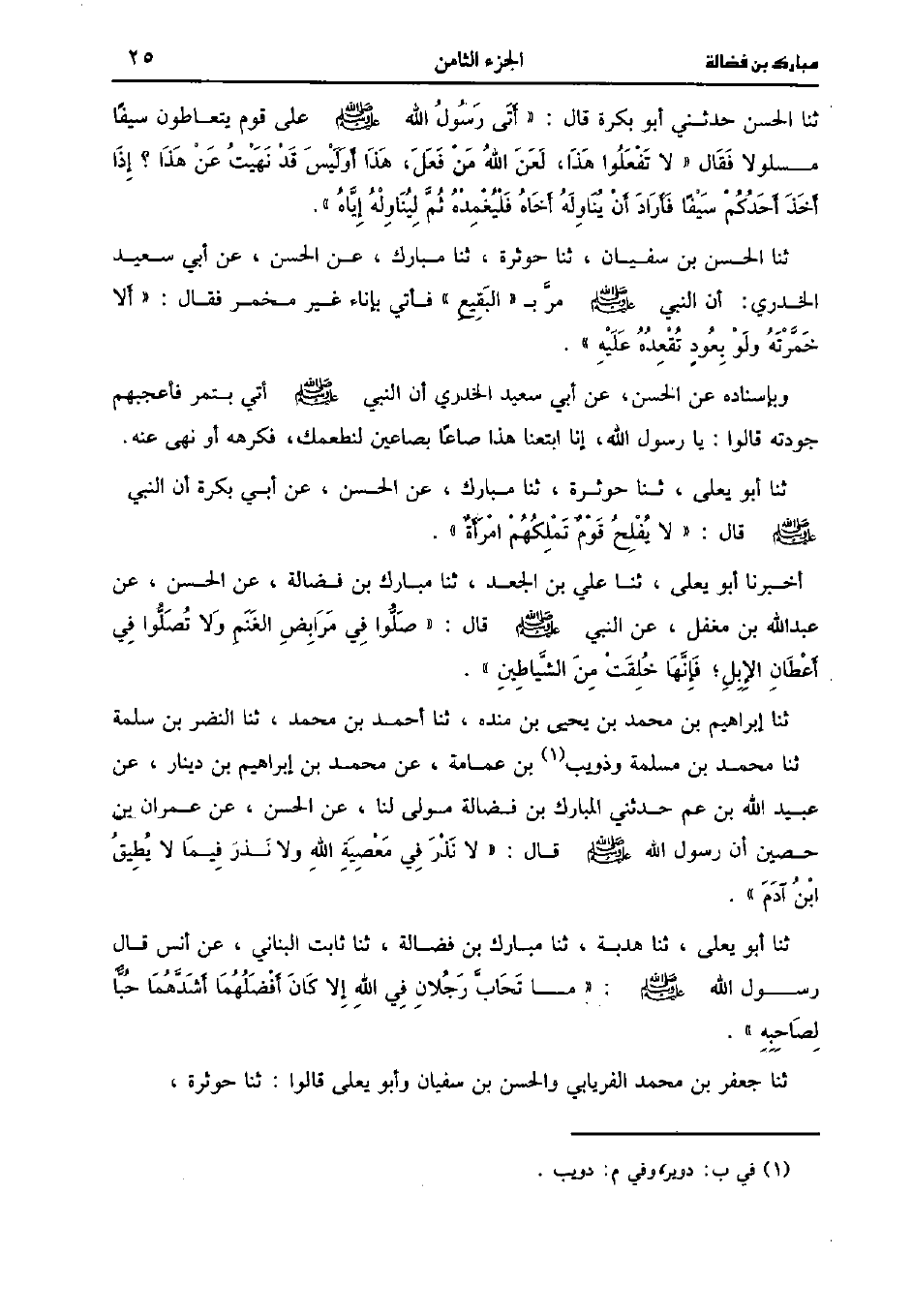حَدَّثَنَا أبو يعلى، حَدَّثَنا حوثرة، حَدَّثَنا مُبَارَكٌ عَنِ الْحَسَنِ، عَن أَبِي بَكْرَةَ أَنَّ النَّبِيَّ صَلَّى اللَّهُ عَلَيه وسَلَّم قَال: لا يُفْلِحُ قوم تملكهم امرأة.