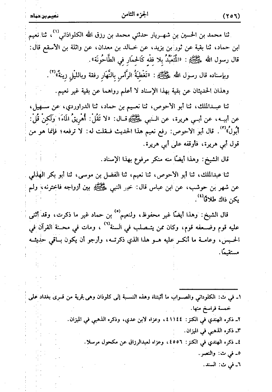 قَالَ الشَّيْخُ: وَهَذَا أَيضًا غَيْرُ مَحْفُوظٍ ولنعيم بْن حَمَّاد غير ما ذكرت وقد أثنى عَلَيْهِ قوم وضعفه قوم وكان ممن يتصلب فِي السنة ومات فِي محنة القرآن فِي الحبس وعامة ما أنكر عَلَيْهِ هو هذا الَّذِي ذكرته وارجوا ان يكون باقي حديثه مستقيما