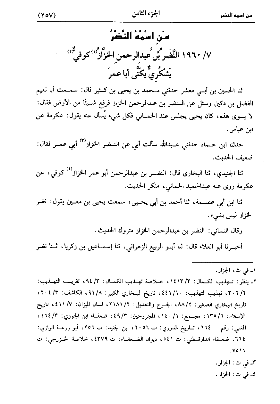 1960- النَّضْر بْن عَبد الرَّحْمَن الخزاز كوفي يشكري، يُكَنَّى أَبَا عُمَر.