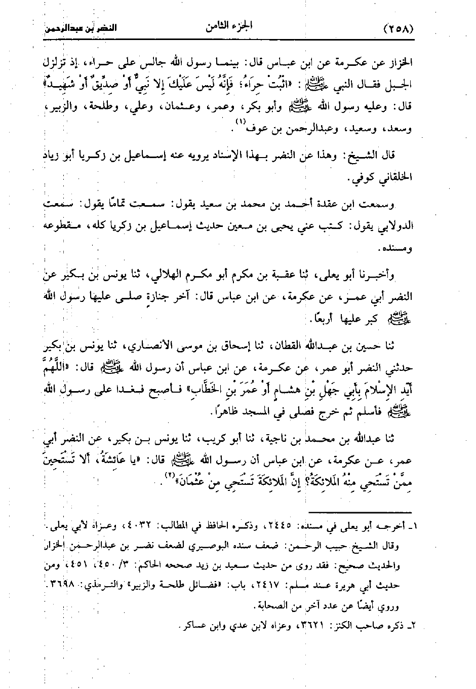 الخزاز، عن عِكرمَة، عنِ ابن عَبَّاسٍ قَالَ بَيْنَمَا رَسُولُ اللَّهِ صَلَّى اللَّهُ عَلَيْهِ وَسَلَّمَ جَالِسٌ عَلَى حِرَاءٍ إِذْ تَزَلْزَلَ الْجَبَلُ فَقَالَ النَّبِيُّ صَلَّى اللَّهُ عَلَيهِ وَسلَّمَ اثْبُتْ حِرَاءً فَإِنَّهُ لَيْسَ عَلَيْكَ إِلا نَبِيٌّ أَوْ صِدِّيقٌ أَوْ شَهِيدٌ قَالَ وَعَلَيْهِ رَسُولُ اللَّهِ صَلَّى اللَّهُ عَلَيْهِ وَسَلَّمَ، وأَبُو بَكْرٍ وَعُمَرُ وَعُثْمَانُ وَعَلِيٌّ وَطَلْحَةُ وَالزُّبَيْرُ وَسَعْدٌ وَسَعِيدٌ، وَعَبد الرَّحْمَنِ بْنُ عَوْفٍ.