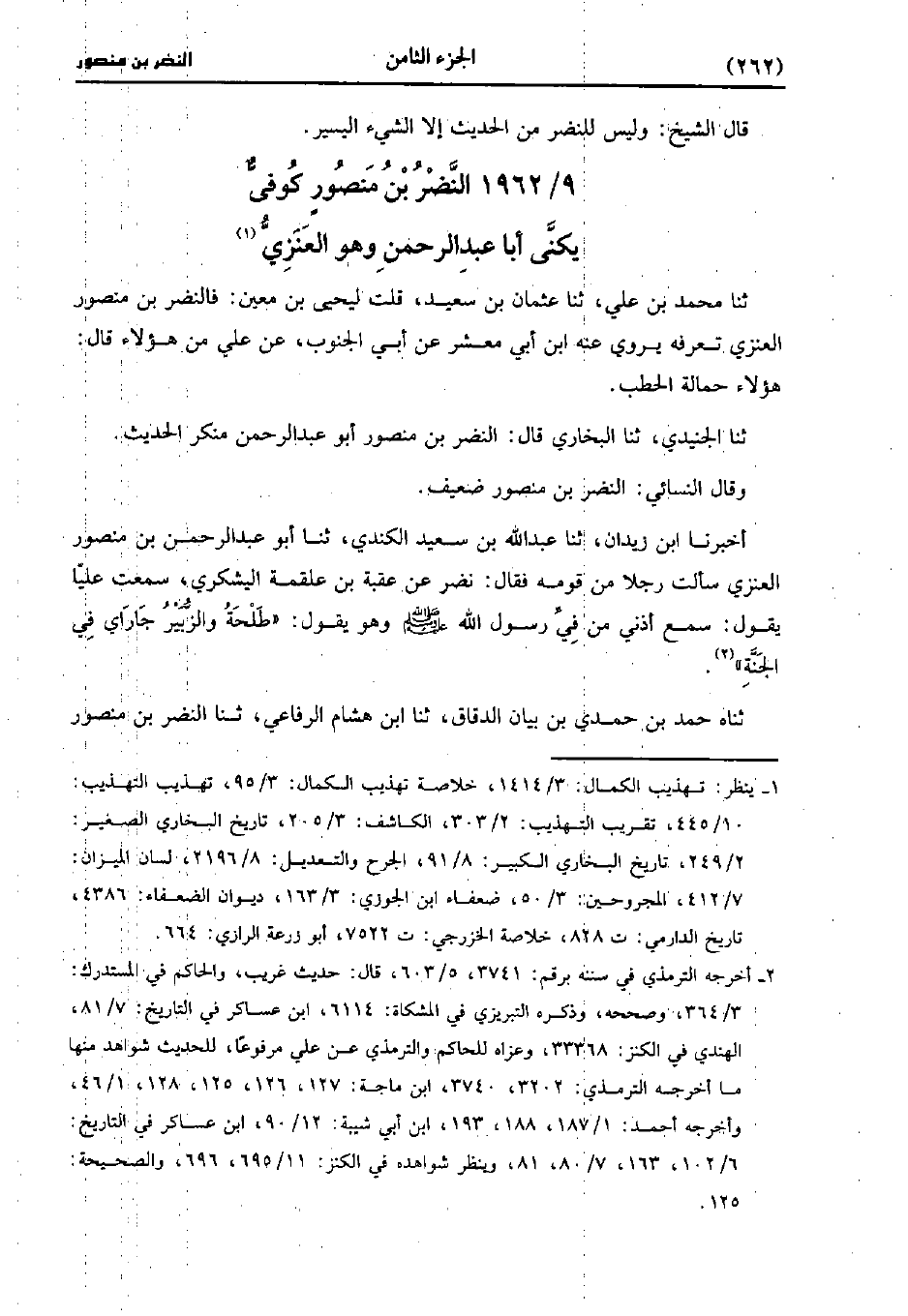 1962- النضر بْن مَنْصُور كوفي، يُكَنَّى أَبَا عَبد الرحمن، وَهو العنزي.
