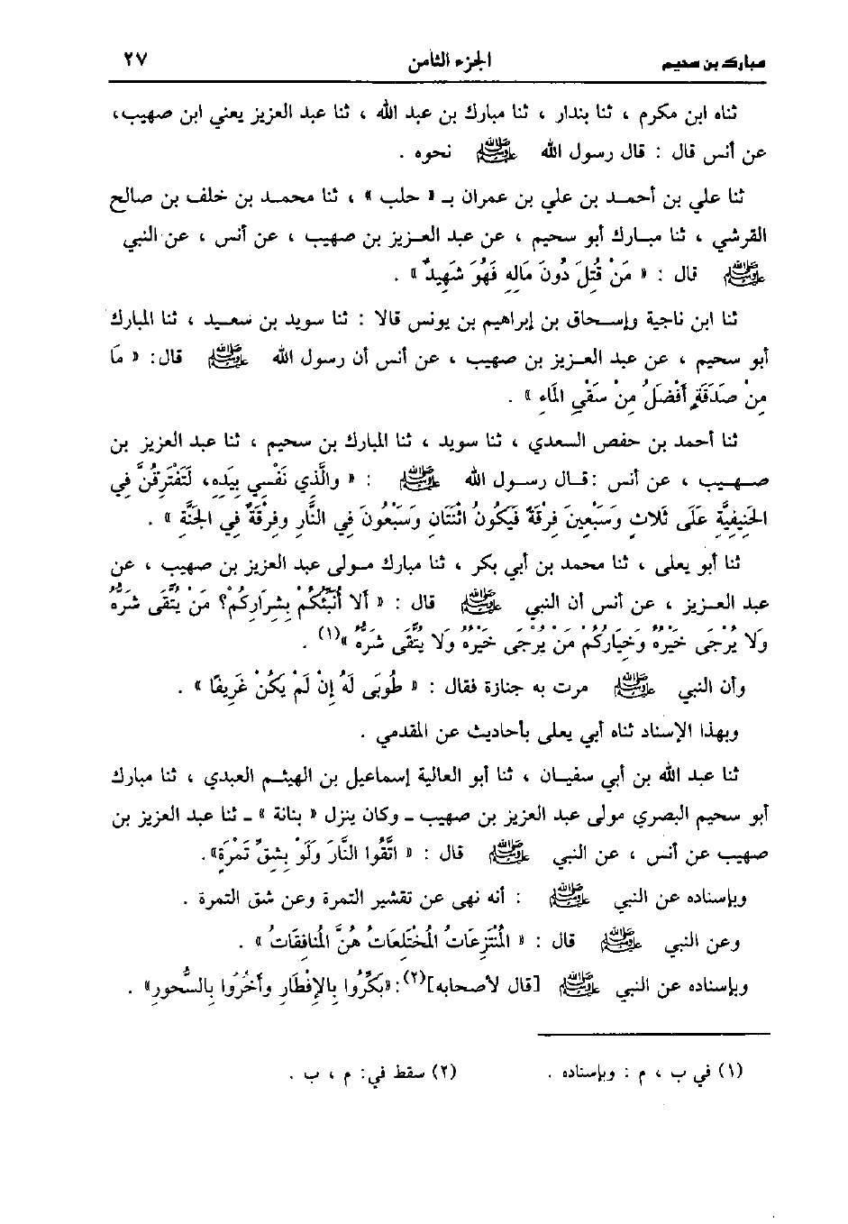 حَدَّثَنَا عَلِيُّ بْنُ أَحْمَدَ بْنِ علي بن عمران بحلب، حَدَّثَنا مُحَمد بْنُ خَلَفِ بْنِ صالح القرشي، حَدَّثَنا مُبَارَكٌ أَبُو سُحَيْمٍ عَنْ عَبد الْعَزِيزِ بْنُ صُهَيْبٍ، عَن أَنَس عَنِ النَّبِيِّ صَلَّى اللَّهُ عَلَيه وسَلَّم قَال: مَنْ قُتِلَ دُونَ ماله فهو شهيد.