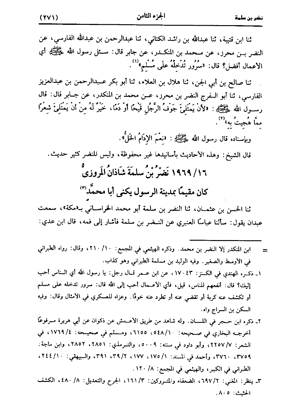 1969- نضر بْن سَلَمَة شاذان المروزي كَانَ مقيما بمدينة الرسول، يُكَنَّى أبا مُحَمد.