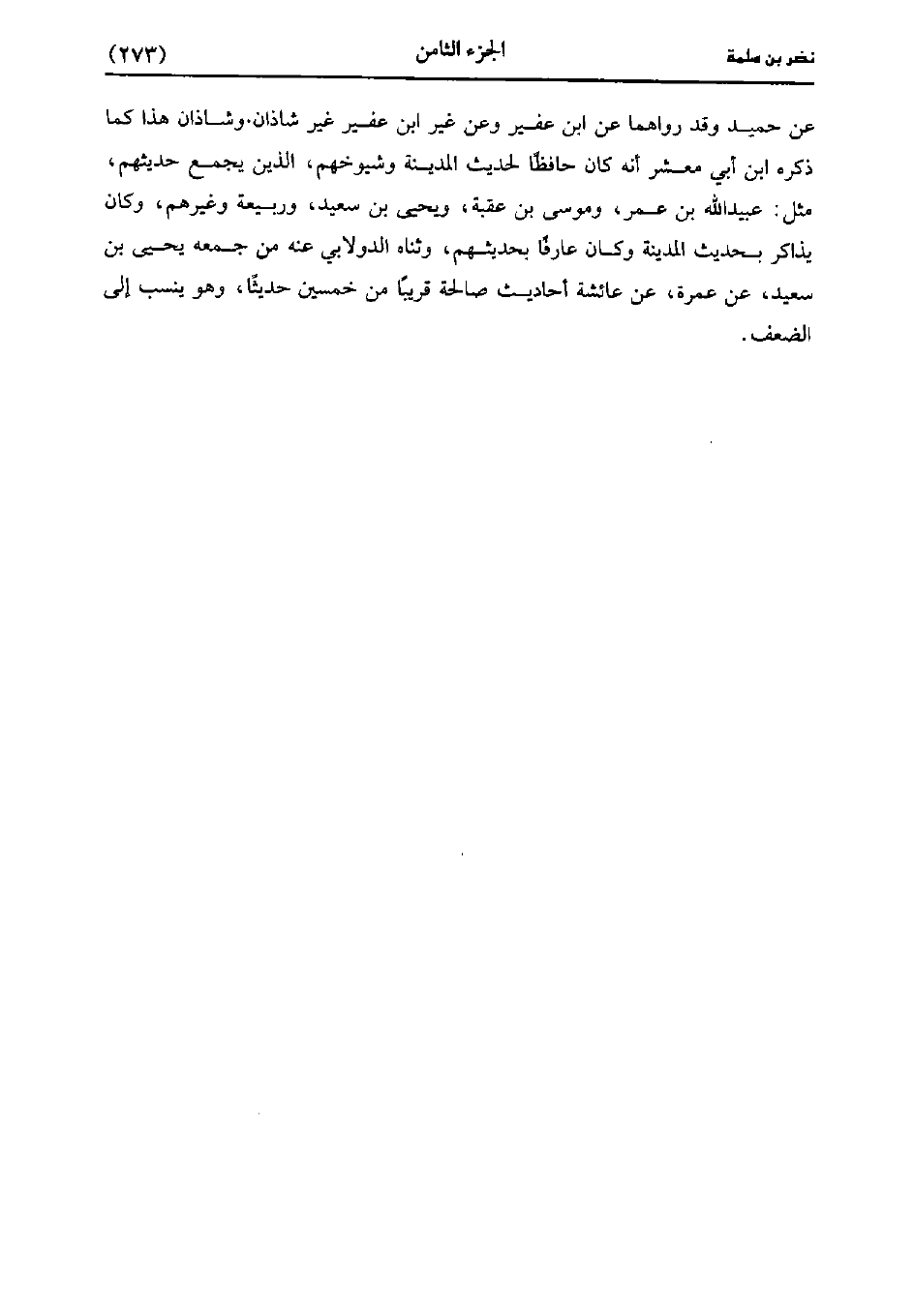 عن حميد وقد رواهما، عنِ ابن عفير وعن غير بن عفير غير شاذان وشاذان هذا كما ذكره بن أبي مَعْشَر أَنَّهُ كَانَ حافظا لحديث المدينة وشيوخهم الذين يجمع حديثهم مثل عُبَيد اللَّه بْن عُمَر وموسى بْن عقبة ويحيى بْن سَعِيد وربيعة وغيرهم وكان يذاكر بحديث المدينة وكان عارفا بحديثهم وثناه الدولابي عَنْهُ من جمعه يَحْيى بْن سَعِيد عن عمرة عن عَائِشَة أحاديث صالحة قريبا من خمسين حديثا، وَهو ينسب إلى الضعف