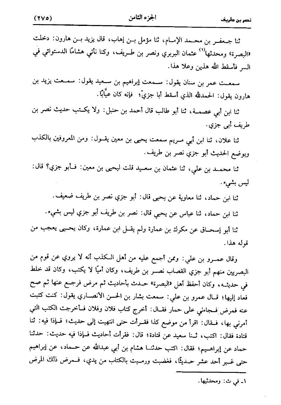 ، حَدَّثَنا جعفر بن مُحَمد الإِمَامُ، حَدَّثَنا مُؤَمِّلُ بْنُ إِهَابٍ قَالَ يَزِيد بْن هارون دخلت البصرة ومحدثها عُثْمَان البربري ونصر بْن طريف وكنا نأتي هشام الدستوائي فِي السر فأسقط الله هذين وعلا هذا.