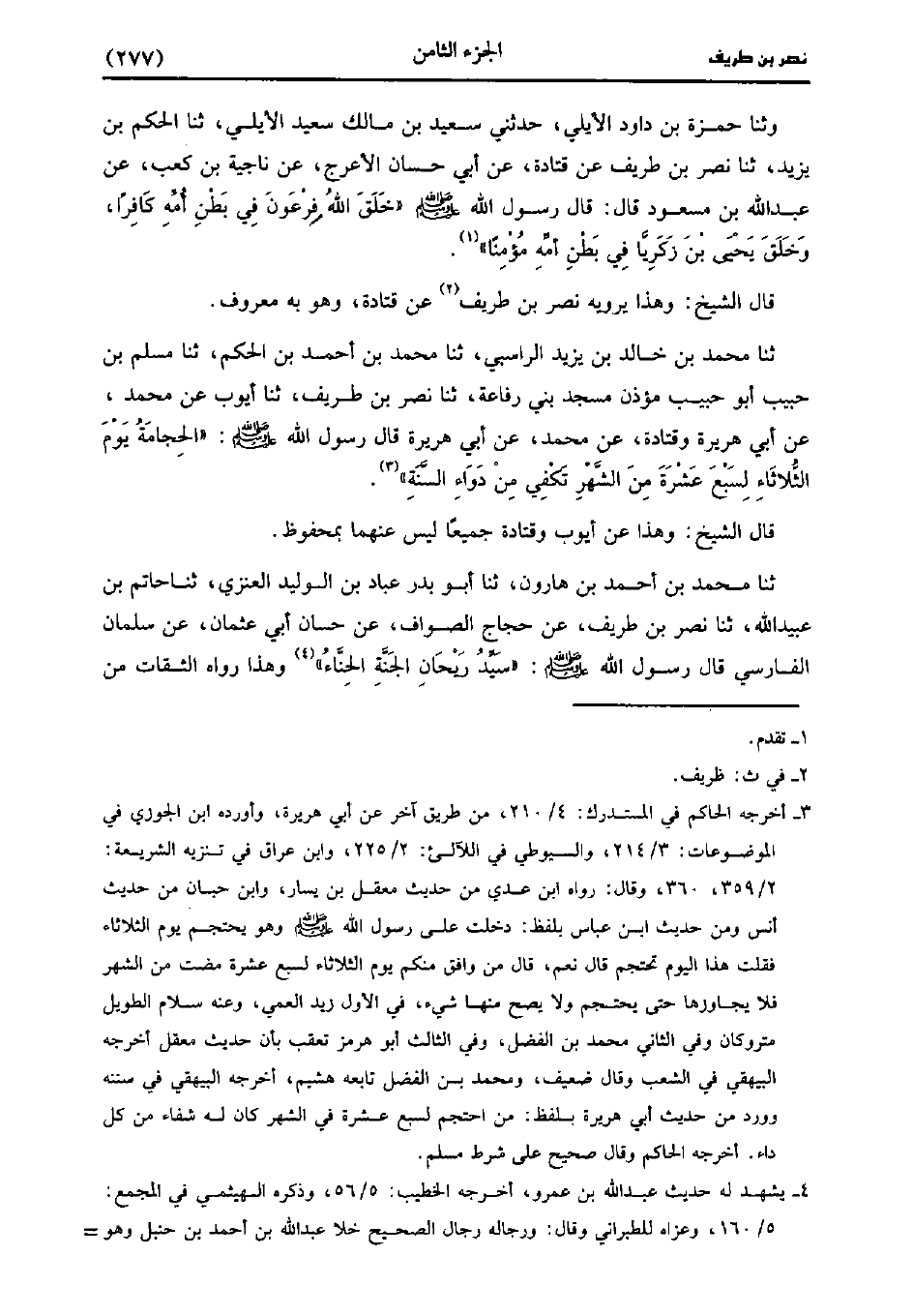 حَدَّثَنَا مُحَمد بْنُ أَحْمَدَ بْنِ هارون، حَدَّثَنا أَبُو بَدْرٍ عَبَّادُ بْنُ الوليد العنزي، حَدَّثَنا حاتم بن عُبَيد اللَّهِ، حَدَّثَنا نَصْرُ بْنُ طَرِيفٍ عَنْ حَجَّاجٍ الصَّوَّافِ عَنْ حَسَّانَ أَبِي عُثْمَانَ عَنْ سَلْمَانَ الْفَارِسِيِّ قَال رَسُول اللهِ صَلَّى اللَّهُ عَلَيهِ وَسلَّمَ سَيِّدُ رَيْحَانِ الْجَنَّةِ الْحِنَّاءُ وهذا رواه الثقات من