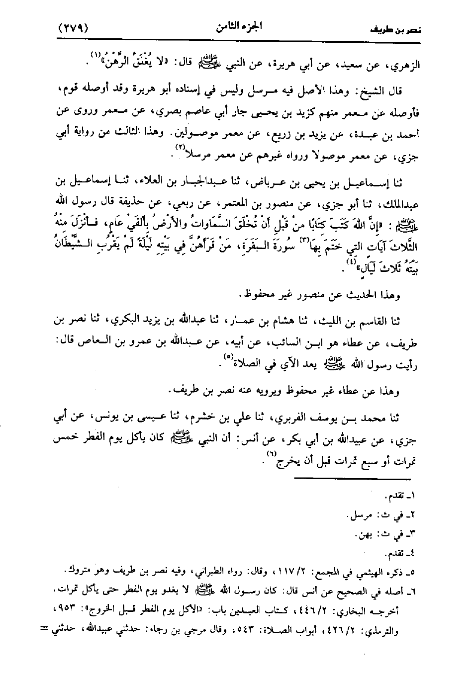 قَالَ الشَّيْخ: وهذا الأصل فيه مرسل وليس فِي إسناده أَبُو هُرَيْرَةَ وقد أوصله قوم فأوصله عن مَعْمَر منهم كزيد بْن يَحْيى جار أبي عَاصِم بصرى عن مَعْمَر وروى عن أَحْمَد بْن عبدة عن يَزِيد بْن زريع عن مَعْمَر موصولين وهذا الثالث من رواية أبي جزي عن مَعْمَر موصولا ورواه غيرهم عن معمر مرسلا.