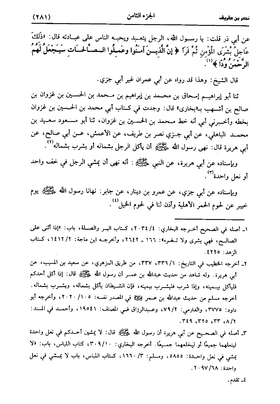 - وَبِإِسْنَادِهِ؛، عَن أَبِي هُرَيْرَةَ عَنِ النَّبِيُّ صَلَّى اللَّهُ عَلَيهِ وَسلَّمَ أَنَّهُ نَهَى أَنْ يَمْشِيَ الرَّجُلُ فِي خُفٍّ وَاحِدٍ أَوْ نَعْلٍ وَاحِدَةٍ.