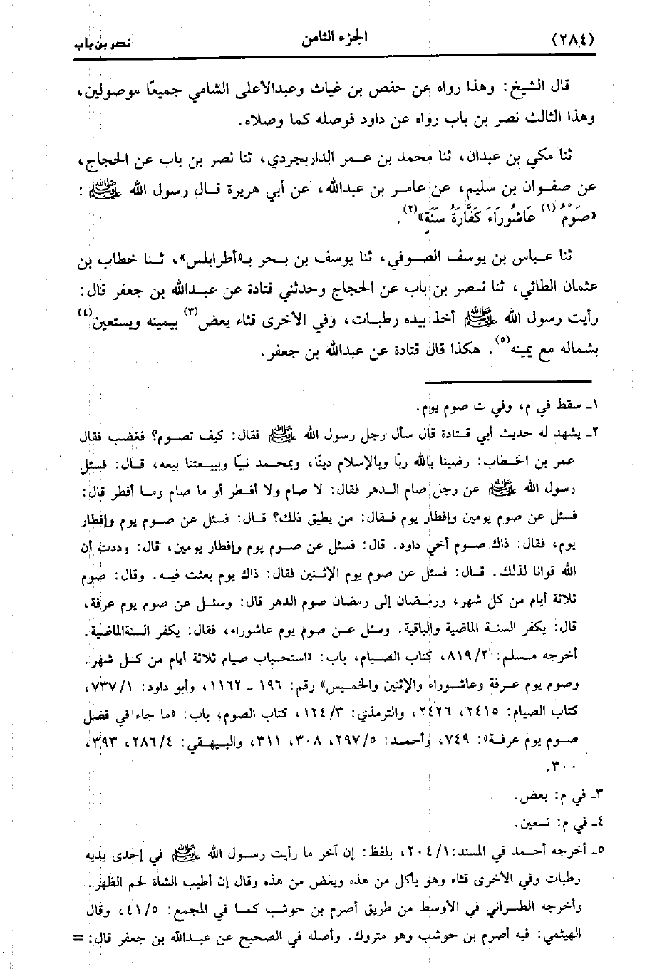 حَدَّثَنَا مَكِّيُّ بْنُ عَبْدَانَ، حَدَّثَنا مُحَمد بن عَمْرو الداربجردى، حَدَّثَنا نَصْرُ بْنُ بَابٍ عَنِ الْحَجَّاجِ عَنْ صَفْوَانَ بْنِ سَلِيمٍ عَنْ عَامِرِ بْنِ عَبد اللَّهِ، عَن أَبِي هُرَيْرَةَ قَال رَسُول اللهِ صَلَّى اللَّهُ عَلَيهِ وَسلَّمَ صَوْمُ عاشوراء كفارة سنة.