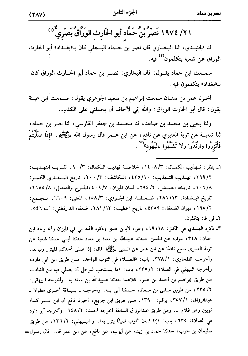 حَدَّثَنَا عُمَر بن سنان سمعت إِبْرَاهِيمَ بْنَ سَعِيد الْجَوْهَرِيُّ يَقُولُ: سَمعتُ ابْن عُيَينة يَقُول: قَالَ أَبُو الحارث الوراق والله إني لأخاف أن يحملني على الكذب (ح) وحدثنا يَحْيى بن مُحَمد ابْنُ صَاعِدٍ، حَدَّثَنا مُحَمد بْنُ جعفر الفارسي، حَدَّثَنا نصر بن حماد، حَدَّثَنا شُعْبَة عَنْ تَوْبَةَ الْعَنْبَرِيِّ عَنْ نَافِعٍ، عنِ ابْنِ عُمَر قَال رَسُول اللهِ صَلَّى اللَّهُ عَلَيهِ وَسلَّمَ إذا صليتم فاتزروا وارتدوا، ولاَ تشبهوا باليهود