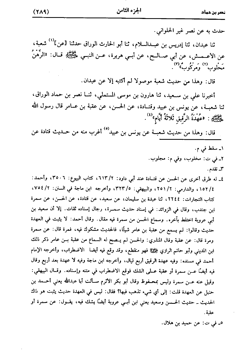 حَدَّثَنَا عَلِيُّ بْنُ سَعِيد، حَدَّثَنا هارون بن موسى المستملى، حَدَّثَنا نصر بن حماد الوراق، حَدَّثَنا شُعْبَة عَنْ يُونُس بْنِ عُبَيد وَقَتَادَةُ عَنْ حَسَنٍ عَنْ عُقْبَةَ بْنِ عَامِرٍ قَال رَسُول اللهِ صَلَّى اللَّهُ عَلَيهِ وَسلَّمَ عُهْدَةُ الرَّقِيقِ ثَلاثَةُ أَيَّامٍ.