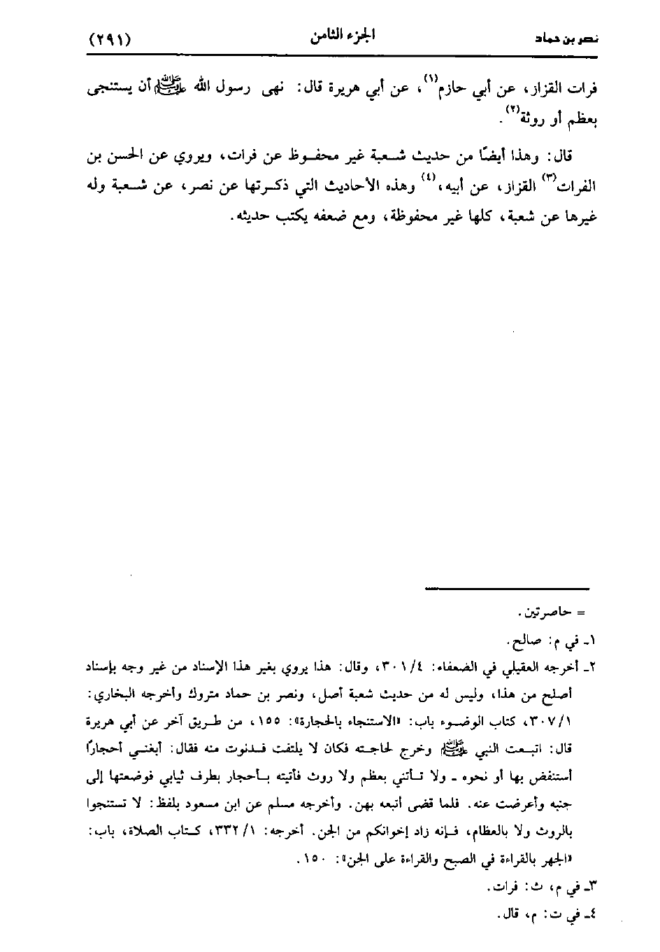 قَالَ وهذا أَيضًا من حديث شُعْبَة غير محفوظ عن فرات ويروى عن الحسن بْن الفرات القزاز، عن أَبِيهِ وهذه الأحاديث الَّتِي ذكرتها عن نصر عن شُعْبَة وله غيرها عن شُعْبَة كلها غير محفوظة ومع ضعفه يكتب حديثه