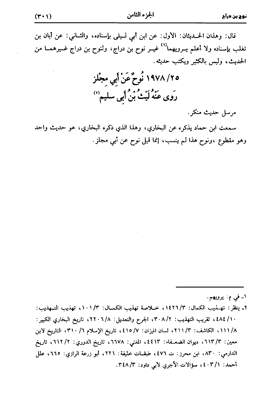 قال وهذان الحديثان الأول، عنِ ابْن أبي ليلى بإسناده والثاني عن أَبَان بْن تغلب بإسناده، ولاَ أعلم يرويهما غير نوح بْن دراج ولنوح بْن دراج غيرهما من الحديث وليس بالكثير ويكتب حديثه.