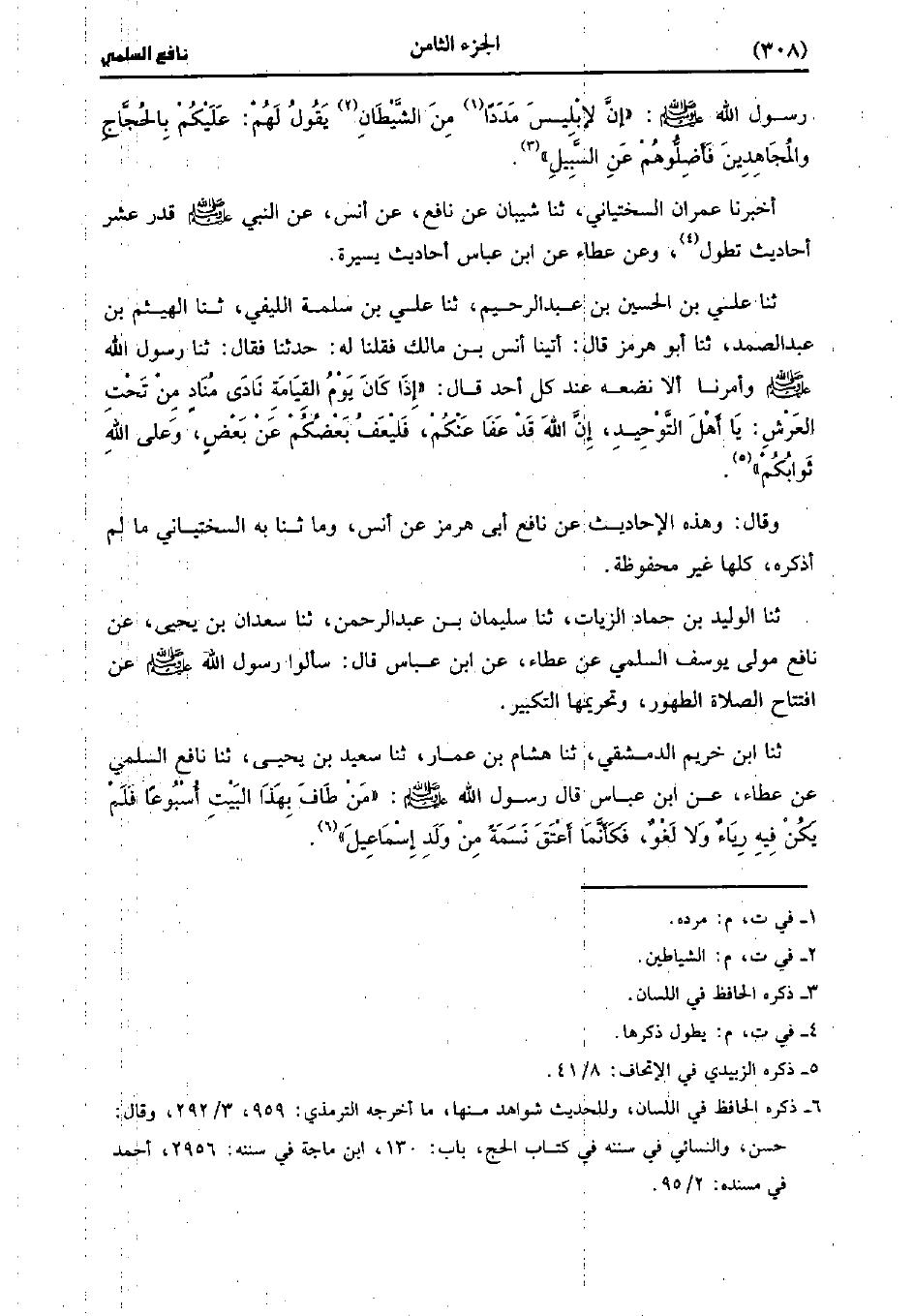 حَدَّثَنَا ابن خُرَيْمٍ الدِّمَشْقِيُّ، حَدَّثَنا هِشَامُ بْنُ عَمَّارٍ، حَدَّثَنا سَعِيد بْنُ يَحْيى، حَدَّثَنا نَافِعٌ السَّلْمِيُّ عَنْ عَطَاءٍ، عنِ ابْنِ عَبَّاسٍ قَال رَسُول اللهِ صَلَّى اللَّهُ عَلَيهِ وَسلَّمَ مِنَ طَافَ بِهَذَا الْبَيْتِ أُسْبُوعًا فَلَمْ يَكُنْ فِيهِ رِيَاءٌ، ولاَ لَغْوٌ فَكَأَنَّمَا أَعْتَقَ نَسَمَةً مِنْ وَلَدِ إسماعيل