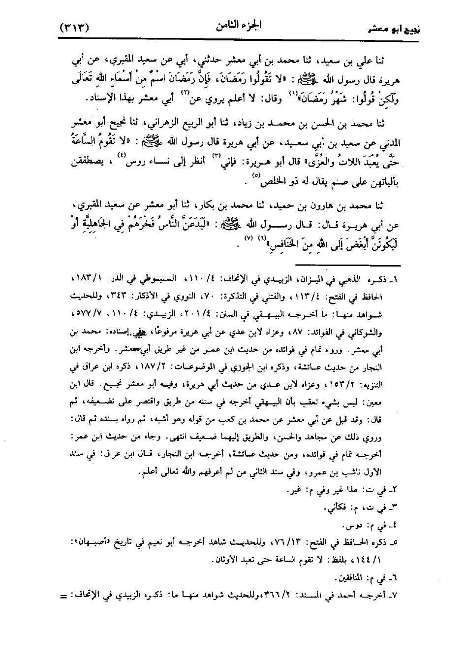 حَدَّثَنَا مُحَمد بْنُ الْحَسَنِ بْنِ مُحَمد بْنِ زِيَادٍ، حَدَّثَنا أَبُو الرَّبِيعِ الزَّهْرَانِيُّ، حَدَّثَنا نَجِيحٌ أَبُو مَعْشَرٍ الْمَدَنِيُّ عَنْ سَعِيد بْنُ أَبِي سَعِيد، عَن أَبِي هُرَيْرَةَ قَال رَسُول اللهِ صَلَّى اللَّهُ عَلَيهِ وَسلَّمَ: لاَ تَقُومُ السَّاعَةُ حَتَّى يُعْبَدَ اللاتُ وَالْعُزَّى قَالَ أَبُو هُرَيْرَةَ فَإِنِّي أَنْظُرُ إِلَى نساء روس يصطفقن بألياتهن على صنم، يُقَال لَهُ: ذو الخلص.