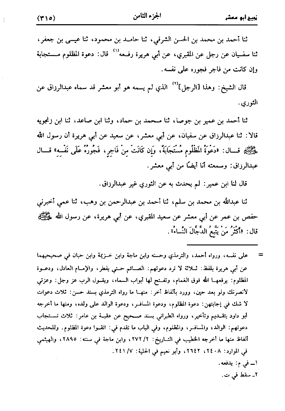 حَدَّثَنَا أَحْمَدُ بْنُ عُمَير بْنِ جَوْصَا، حَدَّثَنا مُحَمد بن حماد وَحَدَّثنا ابن صاعد، حَدَّثَنا ابن زَنْجَوَيْهِ، قالا: حَدَّثَنا عَبد الرَّزَّاق عَنْ سُفْيَانَ، عَن أَبِي مَعْشَرٍ عَنْ سَعِيد، عَن أَبِي هُرَيْرَةَ، أَنّ رَسُولَ اللَّهِ صَلَّى اللَّهُ عَلَيْهِ وَسَلَّمَ صَلَّى اللَّهُ عَلَيه وسَلَّم قَال: دَعْوَةُ الْمَظْلُومِ مُسْتَجَابَةٌ، وَإِنْ كَانَتْ مِنْ فَاجِرٍ فُجُورُهُ عَلَى نَفْسِهِ قَالَ عَبد الرَّزَّاق وسمعته أَنَا أَيضًا من أبي مَعْشَر.