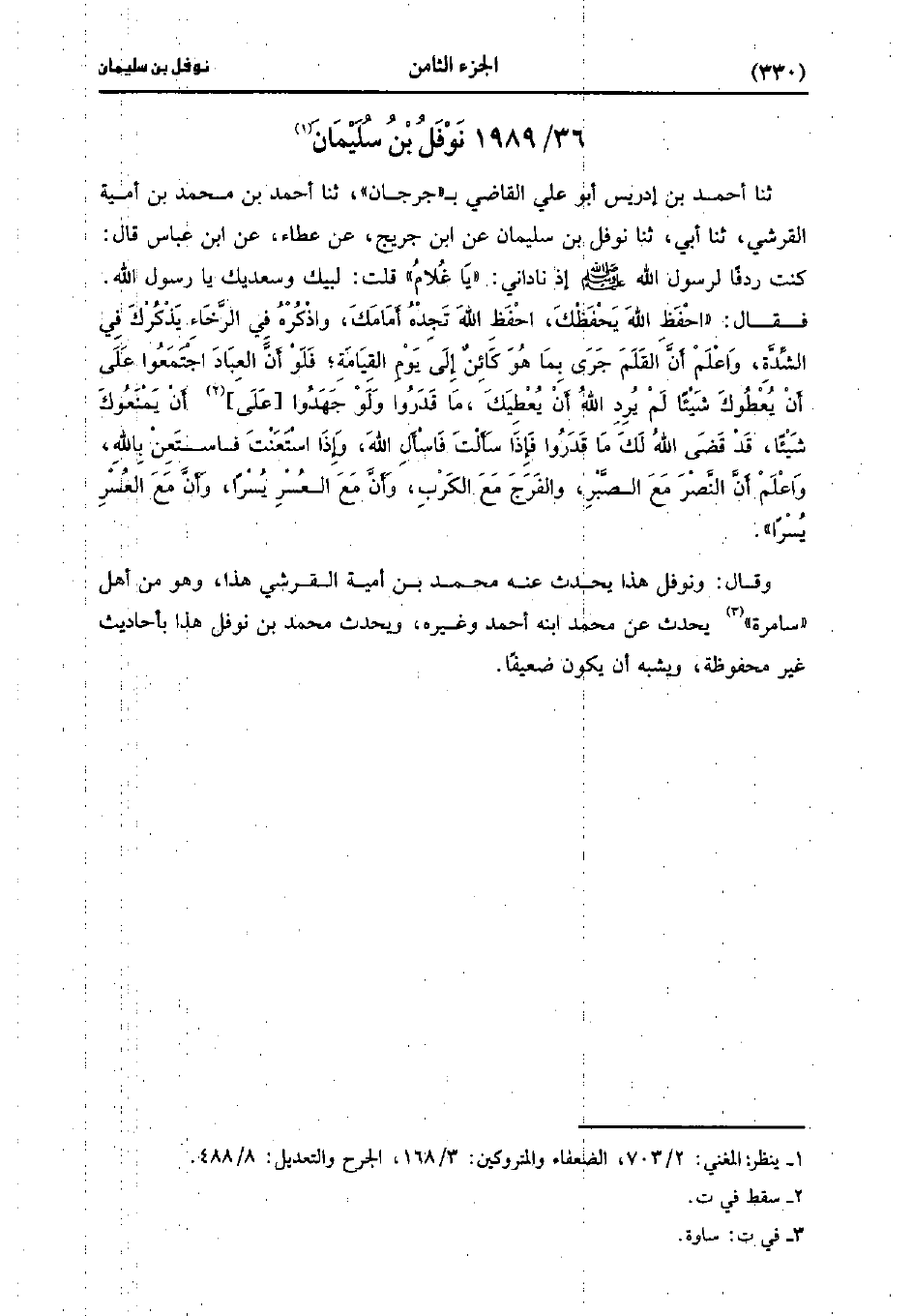 حَدَّثَنَا أحمد بن إِدْرِيسَ أَبُو عَلِيٍّ الْقَاضِيُّ بِجُرْجَانَ، حَدَّثَنا أَحْمَدُ بْنُ مُحَمد بْنِ أمية القرشي، حَدَّثَنا أبي، حَدَّثَنا نَوْفَلُ بْنُ سُلَيْمَانَ، عنِ ابْنِ جُرَيج، عَن عَطَاءٍ، عنِ ابْنِ عَبَّاسٍ قَال: كنتُ رِدْفًا لِرَسُولِ اللَّهِ صَلَّى اللَّهُ عَلَيهِ وَسلَّمَ إِذْ نَادَانِي يَا غُلامُ قُلْتُ لَبَّيْكَ وَسَعْدَيْكَ يَا رَسُولَ اللهِ فقال احفظ الله يحفظ احْفَظِ اللَّهَ تَجِدْهُ أَمَامَكَ وَاذْكُرْهُ فِي الرَّخَاءِ يَذْكُرُكَ فِي الشِّدَّةِ وَاعْلَمْ أَنَّ الْقَلَمَ جَرَى بِمَا هُوَ كَائِنٌ إِلَى يَوْمِ الْقِيَامَةِ فَلَوْ أَنَّ الْعِبَادَ اجْتَمَعُوا عَلَى أَنْ يُعْطُوكَ شَيْئًا لَمْ يُرِدِ اللَّهُ أَنْ يُعْطِيَكَ مَا قَدَرُوا وَلَوْ جَهَدُوا عَلَى أَنْ يَمْنَعُوكَ شَيْئًا قَدْ قَضَى اللَّهُ لَكَ مَا قَدَرُوا فَإِذَا سَأَلْتَ فَاسْأَلِ اللَّهَ، وَإذا اسْتَعَنْتَ فَاسْتَعِنْ بِاللَّهِ وَاعْلَمْ أَنَّ النَّصْرَ مَعَ الصَّبْرِ وَالْفَرَجَ مَعَ الْكَرْبِ، وَأَنَّ مَعَ الْعُسْرِ يُسْرًا، وَأَنَّ مَعَ الْعُسْرِ يسرا.