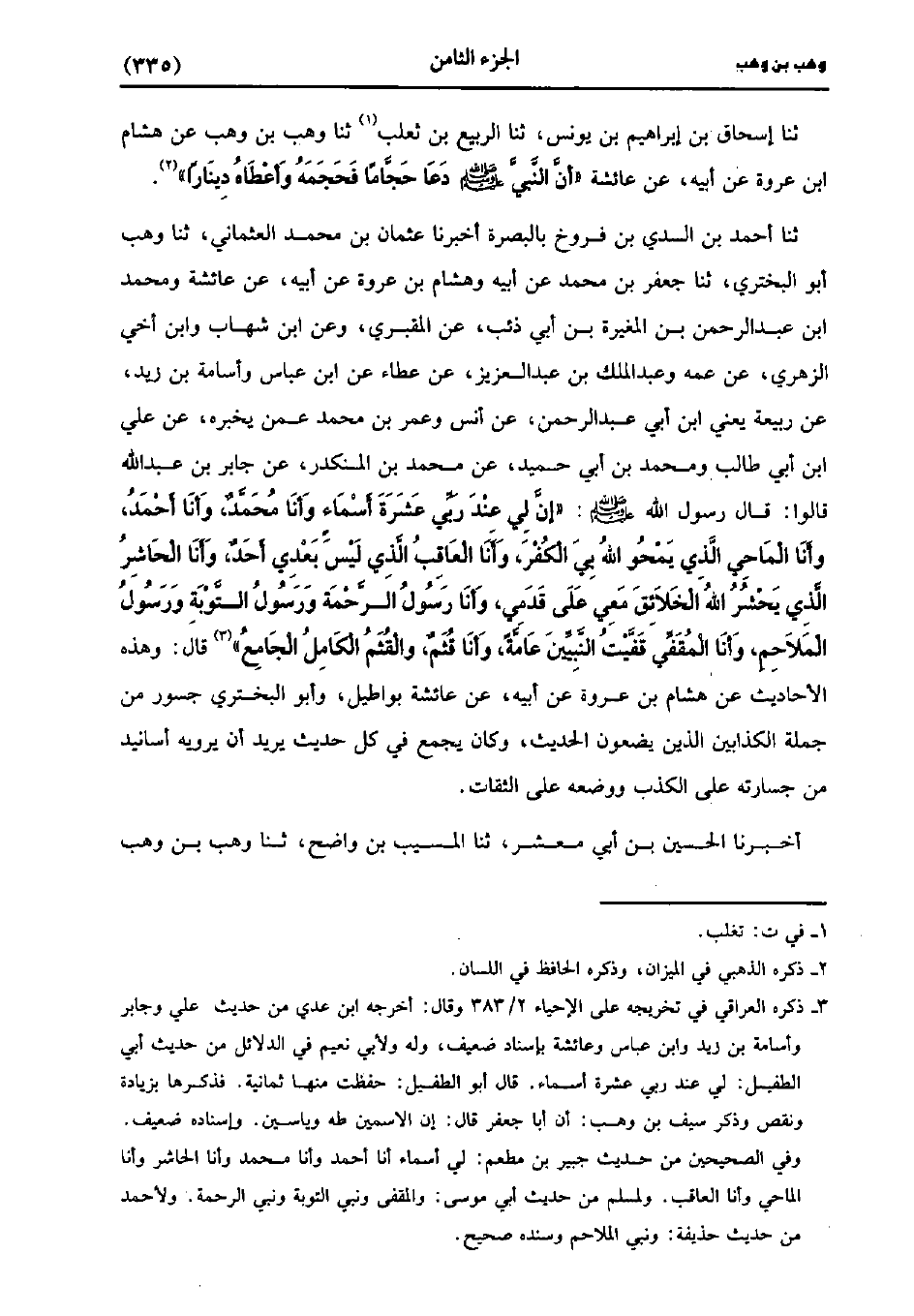 حَدَّثَنَا أَحْمَدُ بْنُ السُّدِّيِّ بْنِ فَرُّوخٍ بِالْبَصْرَةِ، أَخْبَرنا عُثْمَانُ بْنُ مُحَمد العثماني، حَدَّثَنا وهب أبا البختري، حَدَّثَنا جَعْفَرُ بْنُ مُحَمد، عَنْ أَبِيهِ، وهِشام بْنُ عُرْوَةَ، عَنْ أَبِيهِ عَنْ عَائِشَةَ، وَمُحمد بْنُ عَبد الرَّحْمَنِ بْنِ الْمُغِيرَةِ بْنِ أَبِي ذِئْبٍ عَنِ الْمَقْبُرِيِّ وَعَنِ بن شِهَابٍ، وَابْنُ أَخِي الزُّهْريّ، عَن عَمِّه، وَعَبد الْمَلِكِ بْنِ عَبد الْعَزِيزِ عَنْ عَطَاءٍ، عنِ ابْنِ عَبَّاسٍ وَأُسَامَةُ بْنُ زَيْدٍ عَنْ ربيعة يعنى بْنِ أَبِي عَبد الرَّحْمَنِ، عَن أَنَس وَعُمَرُ بْنُ مُحَمد عَمَّنْ يُخْبِرُهُ عَنْ عَلِيِّ بْنِ أَبِي طَالِبٍ، وَمُحمد بْنُ أَبِي حُمَيْدٍ عَنْ مُحَمد بْنِ الْمُنْكَدِرِ عَنْ جَابِرِ بْنِ عَبد اللَّهِ قَالُوا قَال رَسُول اللهِ صَلَّى اللَّهُ عَلَيهِ وَسلَّمَ: إِنَّ لِي عِنْدَ رَبِّي عَشَرَةُ أَسْمَاءٍ وَأَنَا مُحَمد وَأَنَا أَحْمَدُ وَأَنَا الْمَاحِي الَّذِي يَمْحُو اللَّهُ بِيَ الْكُفْرَ وَأَنَا الْعَاقِبُ الَّذِي لَيْسَ بَعْدِي أَحَدٌ وَأَنَا الْحَاشِرُ الَّذِي يَحْشُرُ اللَّهُ الْخَلائِقَ مَعِي عَلَى قَدَمِي وَأَنَا رَسُولُ الرَّحْمَةِ وَرَسُولُ التَّوْبَةِ وَرَسُولُ الملاحم وانا المقفي قضيت النبيين عامة وانا قثم والوثم الْكَامِلُ الْجَامِعُ قَالَ وهذه الأحاديث عَنْ هِشَامِ بْنِ عُرْوَةَ، عَنْ أَبِيهِ عن عَائِشَة بواطيل، وأَبُو البخترى جسور من جملة الكذابين الذين يضعون الحديث وكان يجمع فِي كل حديث يريد أن يرويه أسانيد من جسارته على الكذب ووضعه على الثقات.
