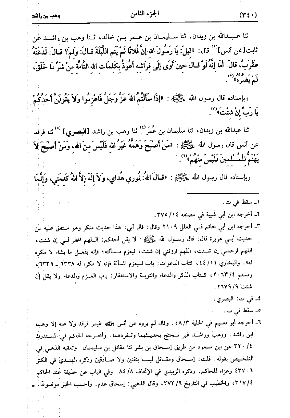 - وَبِإِسْنَادِهِ؛ قَال رَسُول اللهِ صَلَّى اللَّهُ عَلَيهِ وَسلَّمَ إِذَا سَأَلْتُمُ اللَّهَ عَزَّ وَجَلَّ فَاعْزِمُوا، ولاَ يَقُولَنَّ أَحَدُكُمْ يَا رَبِّ إِنْ شِئْتَ.
